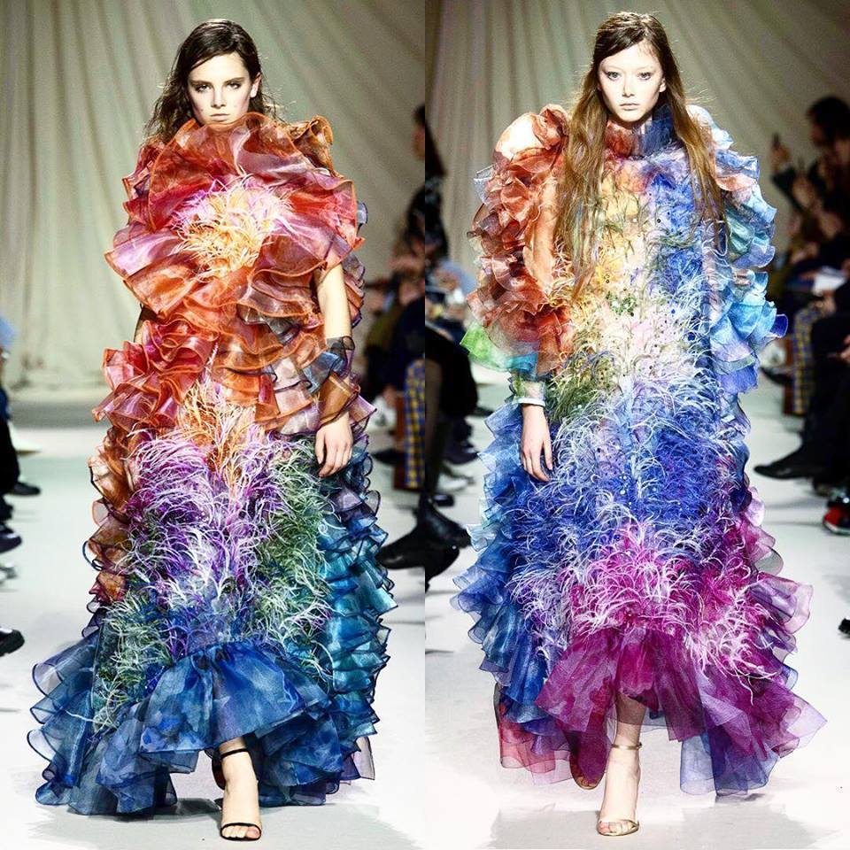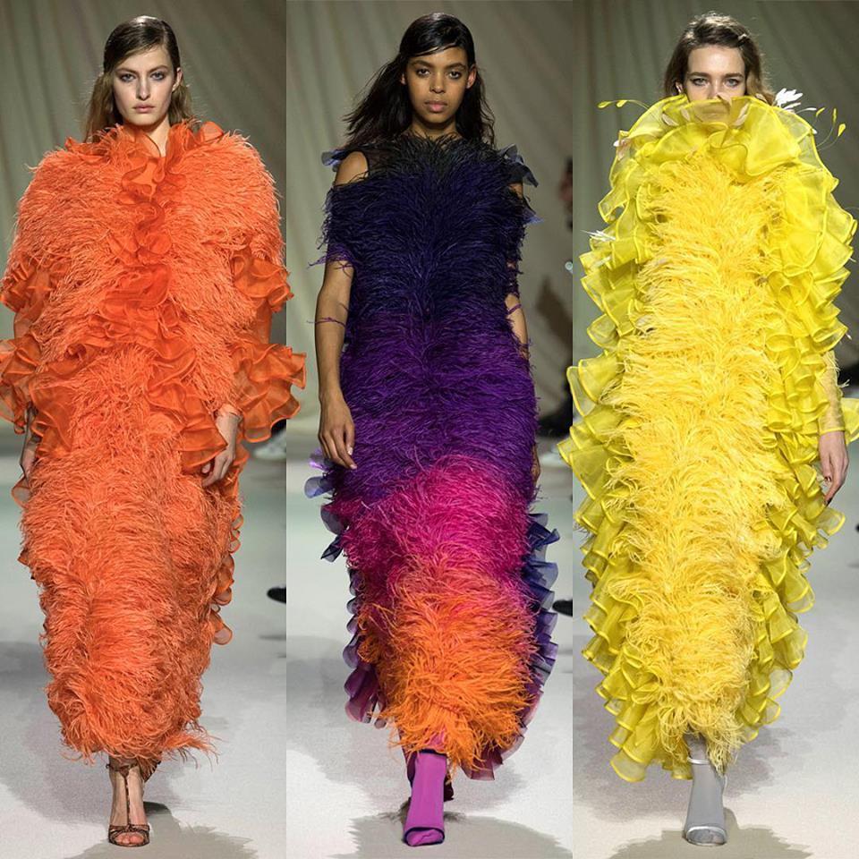 Characteristic features: Distinctive colors and patterns, unconventional materials, pompousness, prints contoured by the means of digital technology.
