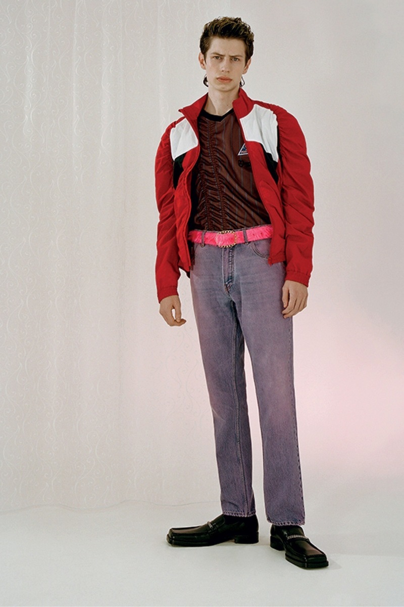 In the collection FW 19/20 Martin Rose, you can expect approximately this: high-waisted carrot-fit jeans and a belt with a buckle, T-shirts tucked in pants, short embellished jean jackets or longer jackets in shiny leather. The only occasion for these outfits would be a party in the 70s or 80s style.