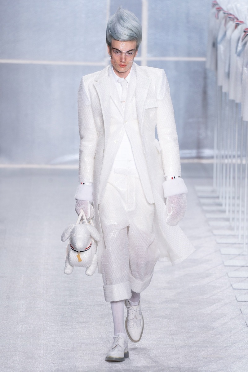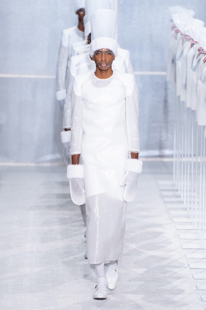 We just found ourselves in the movie Chronicles of Narnia, where the ice queen had the outfit and make-up in a style similar to the men on the Thom Browne show. Long dresses and coats with women's silhouette look at least strange on men.
