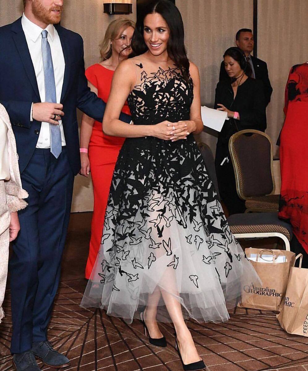 In my opinion, the transparent-black dress from Oscar de la Renta is the most beautiful of all. I see an innovative modern approach to a classically cut dress here, resulting in a completely different style. Plus, Meghan looks sweet in it!