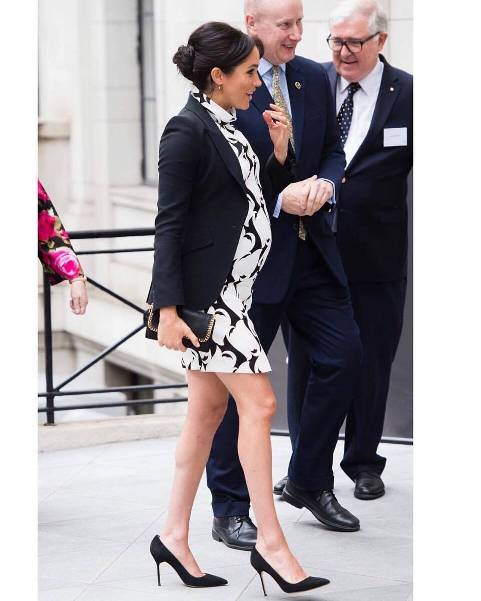 Meghan’s belly was visibly arching under the dark blue shimmering dress by Roland Mouret, which she wore at the beginning of the year. But that didn't stop her from putting on Stuart Weitzman's shoes, adding a Givenchy letterbox and heading out.