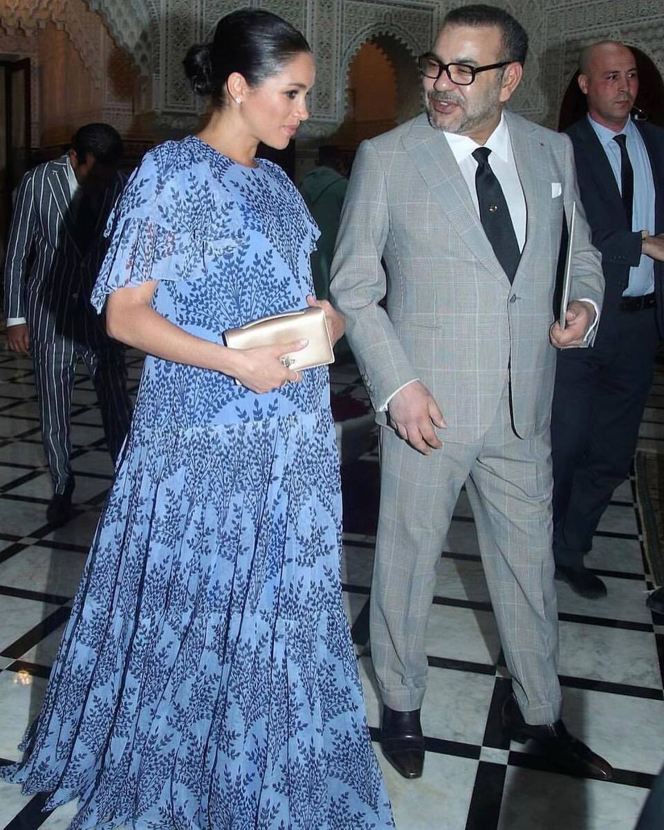 For a meeting with the Moroccan King Muhammad VI., Meghan put on a visibly comfortable Carolina Herrera dress, which she complemented with a Dior letterbox. The heavenly shade of blue was a perfect fit for the Duchess, and it was great to see her in something less formal for once.