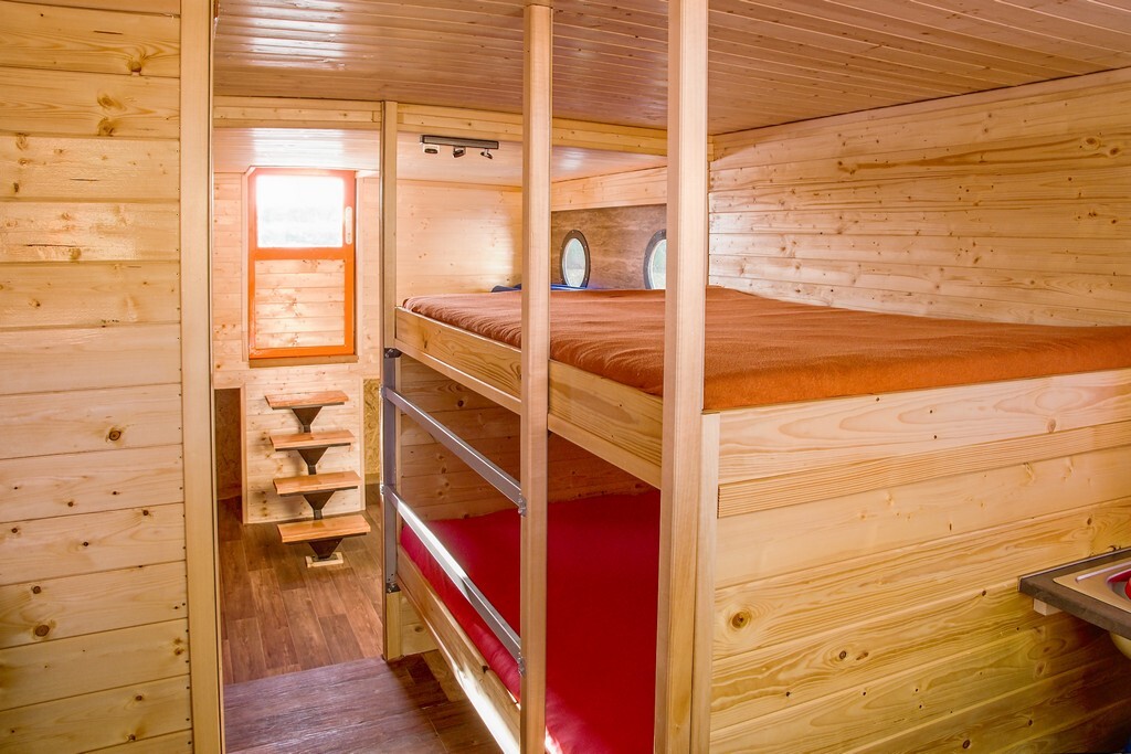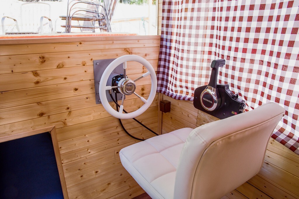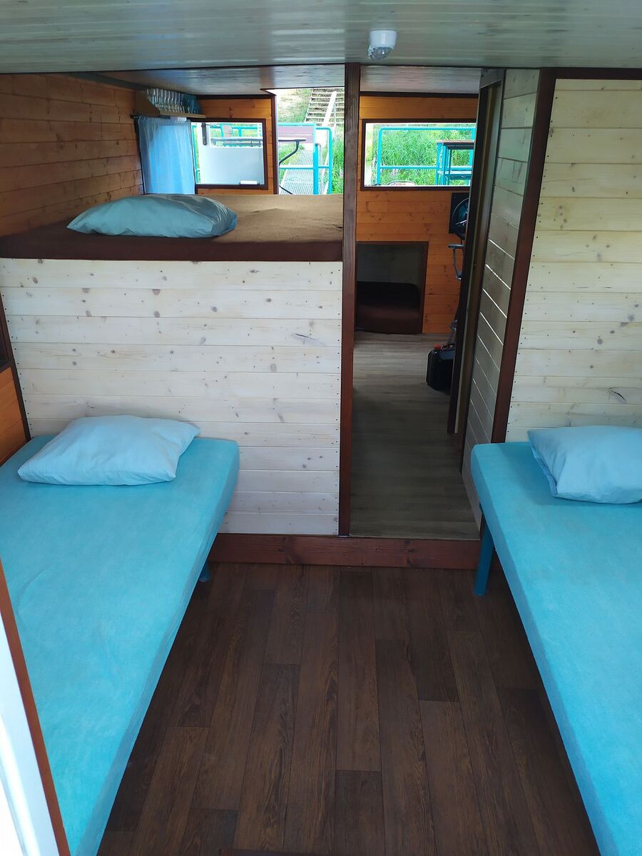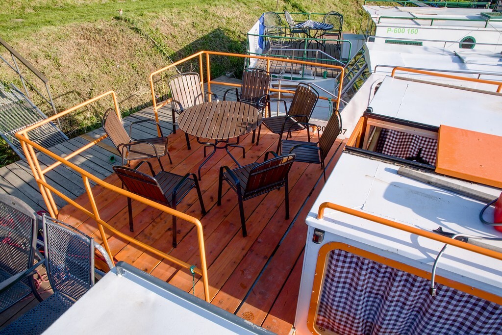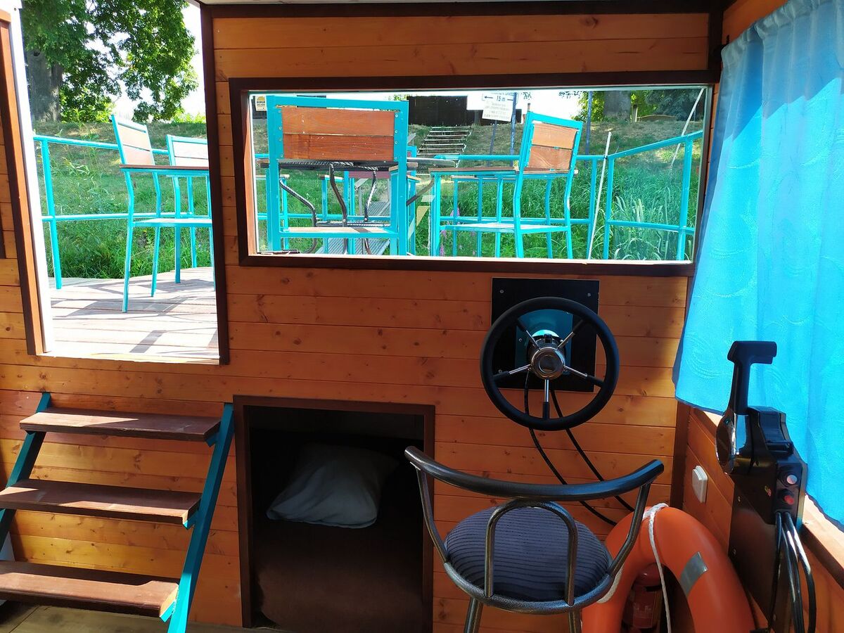 The houseboats have sliding sides, enough space inside and outside, a stand for up to 8 wheels, interior height of 2 meters, sufficient storage space, an equipped kitchen, cozy interiors, space for outdoor seating and the company offers a closed parking lot, where you can leave your car for the duration of the cruise.
