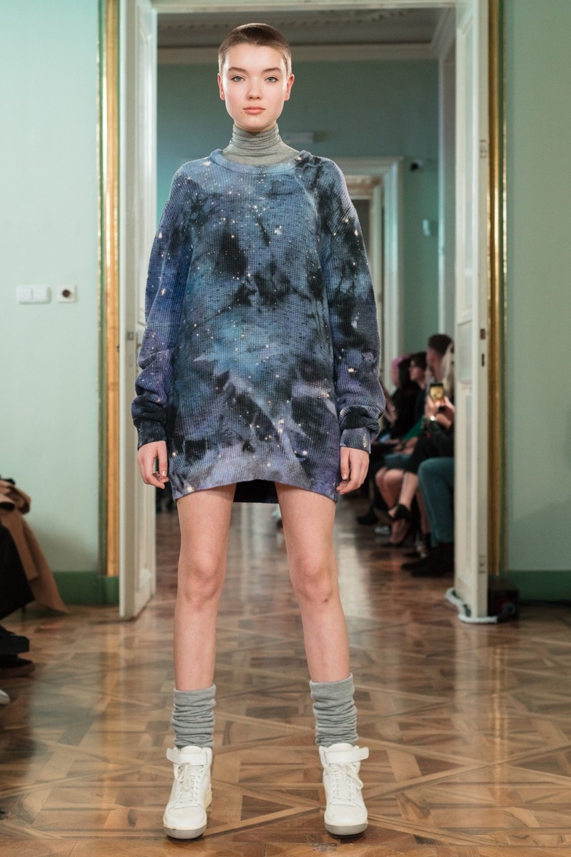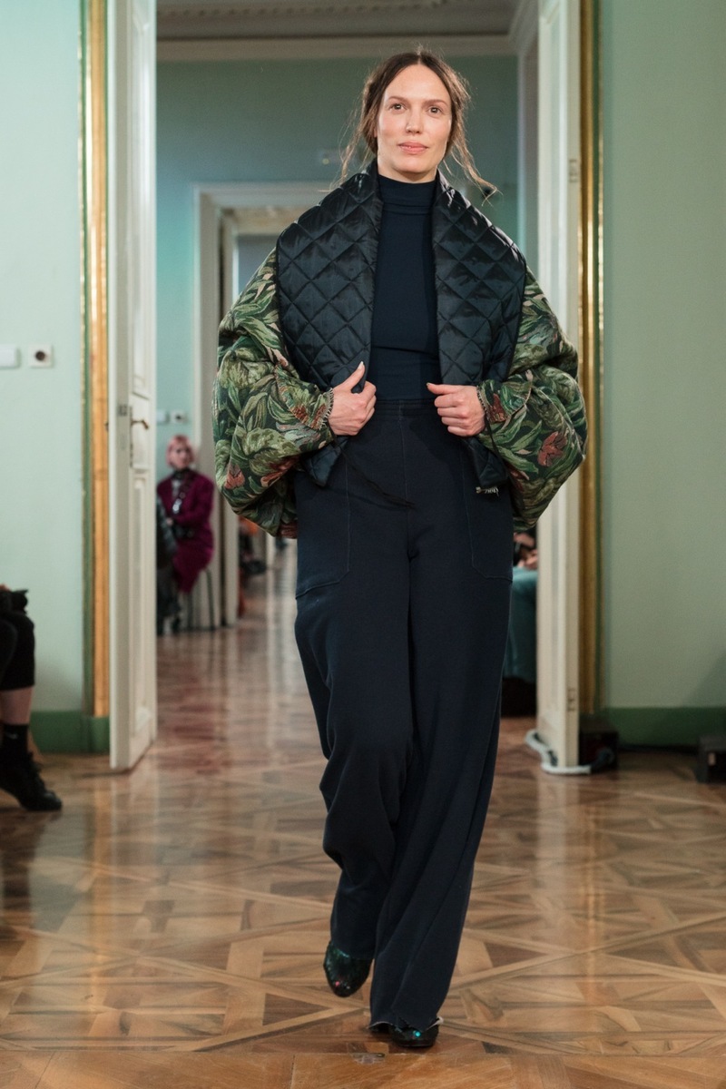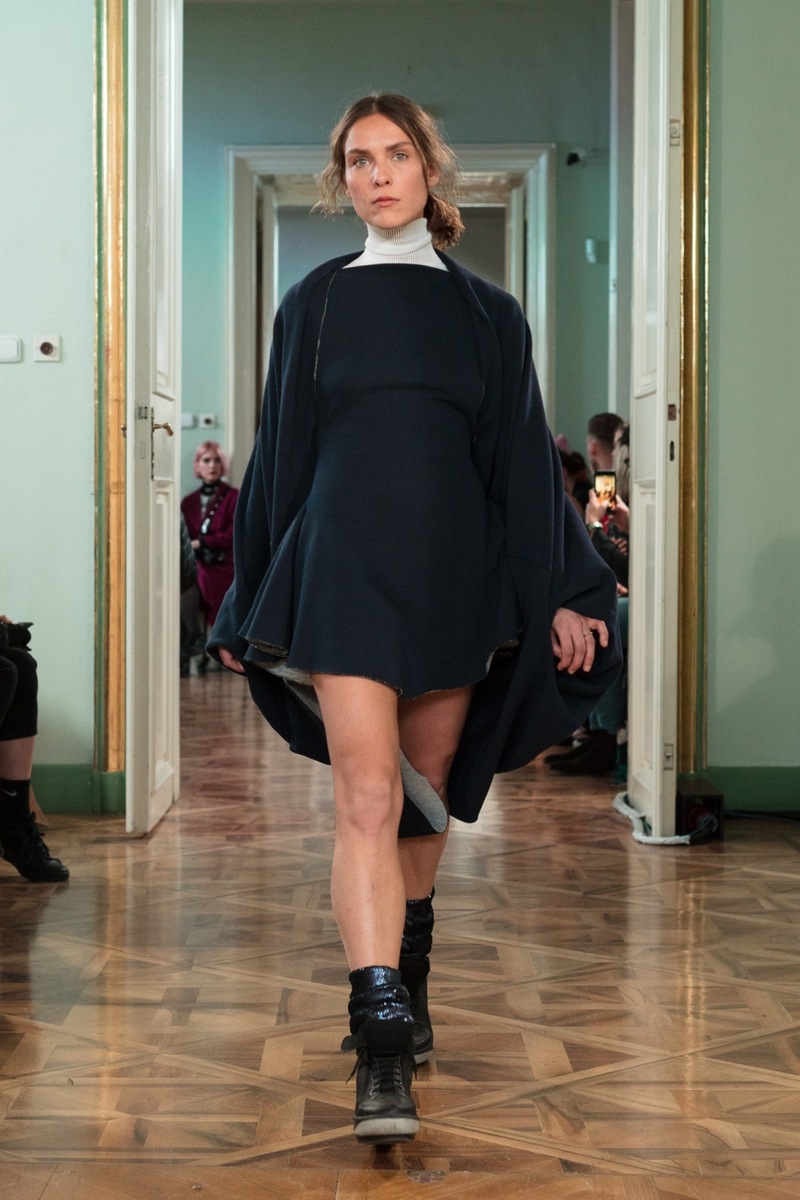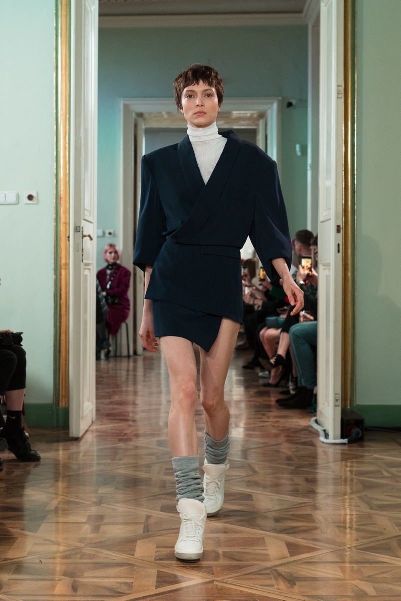 The atmosphere at the Jakub Polanka show was pleasant and electrifying at the same time. One of the things I enjoyed from the front line was the electronic music mixed with samples from the film Angelika. Then, among the almost transparent models (with an expression as though they’d just escaped the psychiatric ward – then didn’t even blink), actress Jana Plodková appeared on the catwalk. On the contrary, she delighted me with her positive expression! Nevertheless, her dress wasn’t much of a success – it would probably work well as a nightgown.