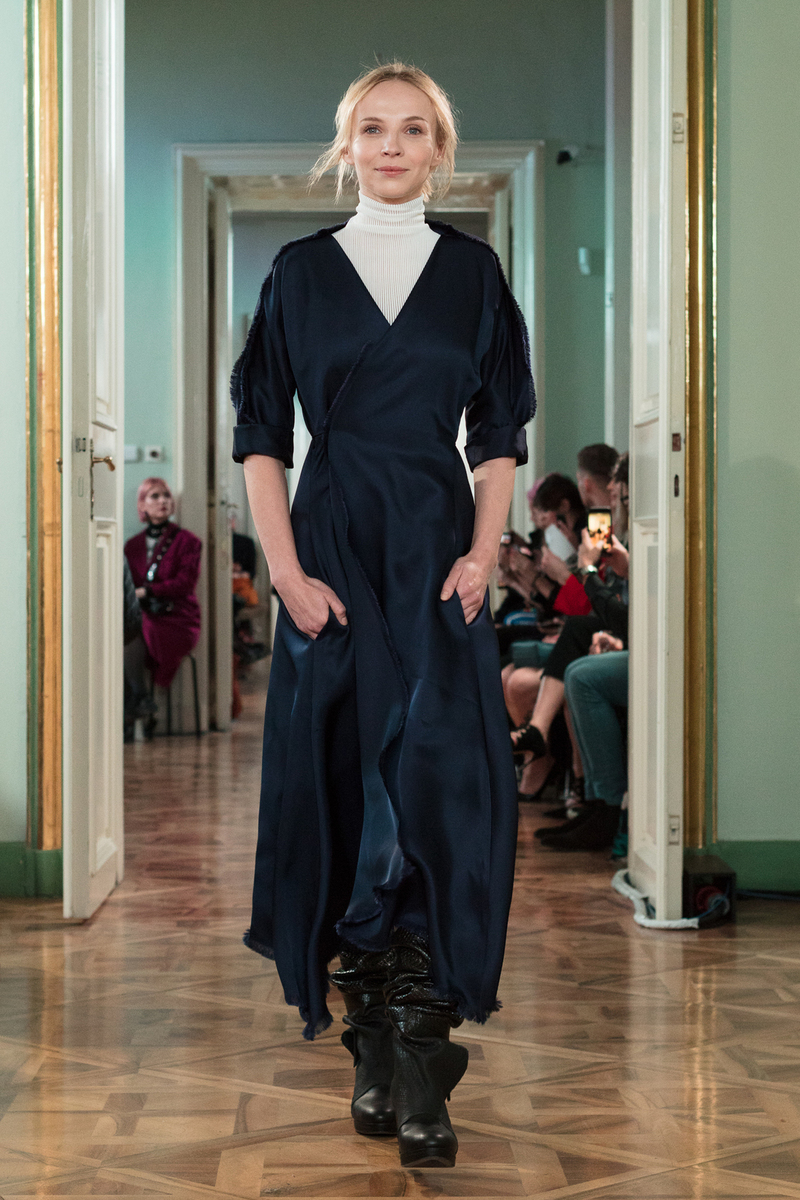 Jakub Polanka bet once again on the fine features and striking personality of one of the most popular actresses of the present, Jana Plodková. She gives preference to Czech designers before foreign brands, and has worked with Jakub several times before. She has modelled for him on the runway and worn his garments at social events. Once again, she presented her outfit at the show quite perfectly. The shiny royal blue dress complemented with a dainty turtleneck fit her like a glove. Elegant simply suits her!