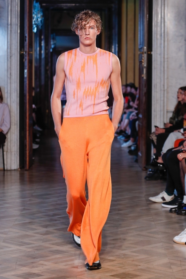 This is certainly suggested by the above-stated colours used. The collection is dominated by loose-fitting bell-bottomed trousers with a touch of retro. The sleeveless tops reveal manly arms. From the materials you can see leather as well as knitted fabrics.