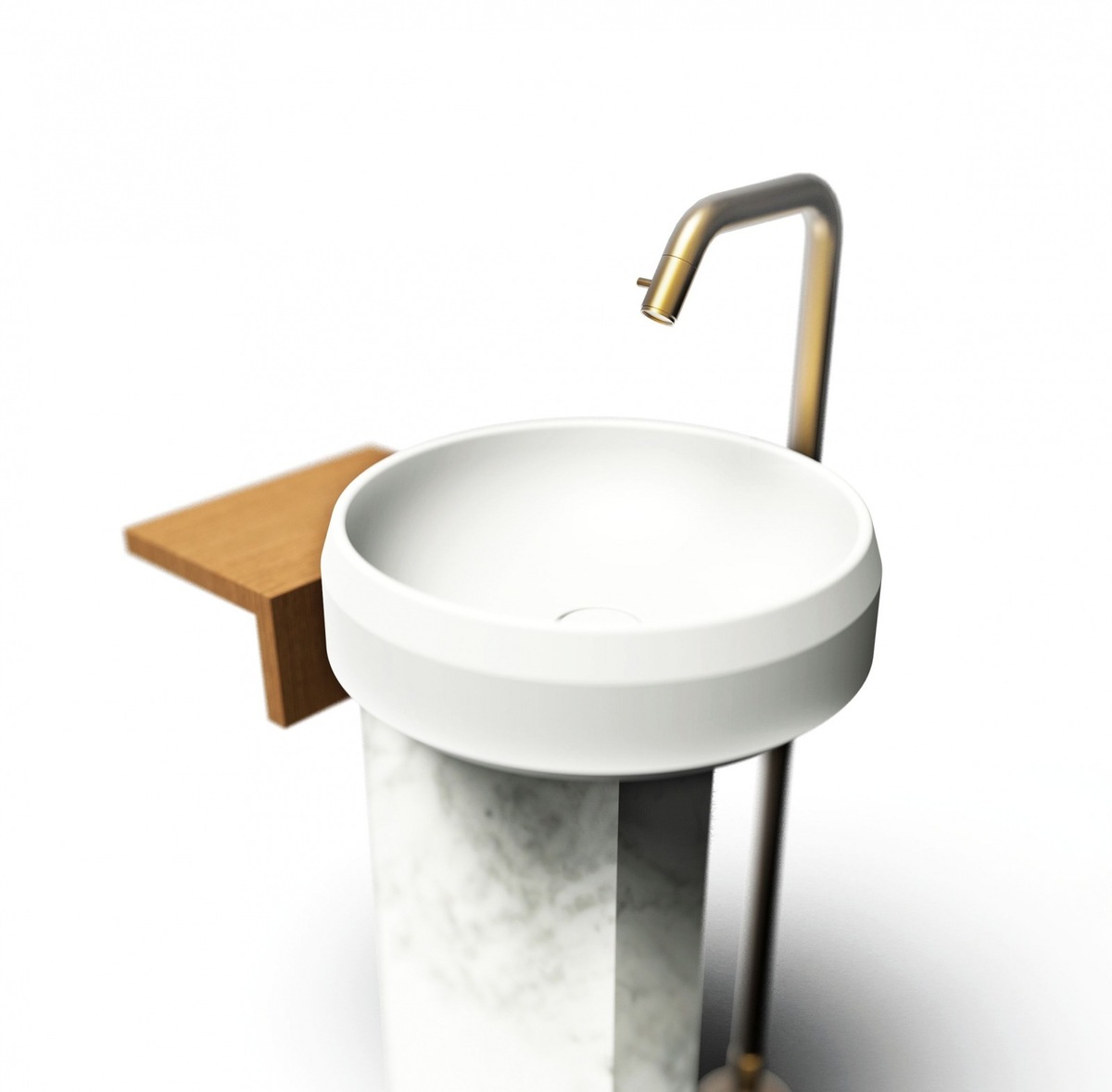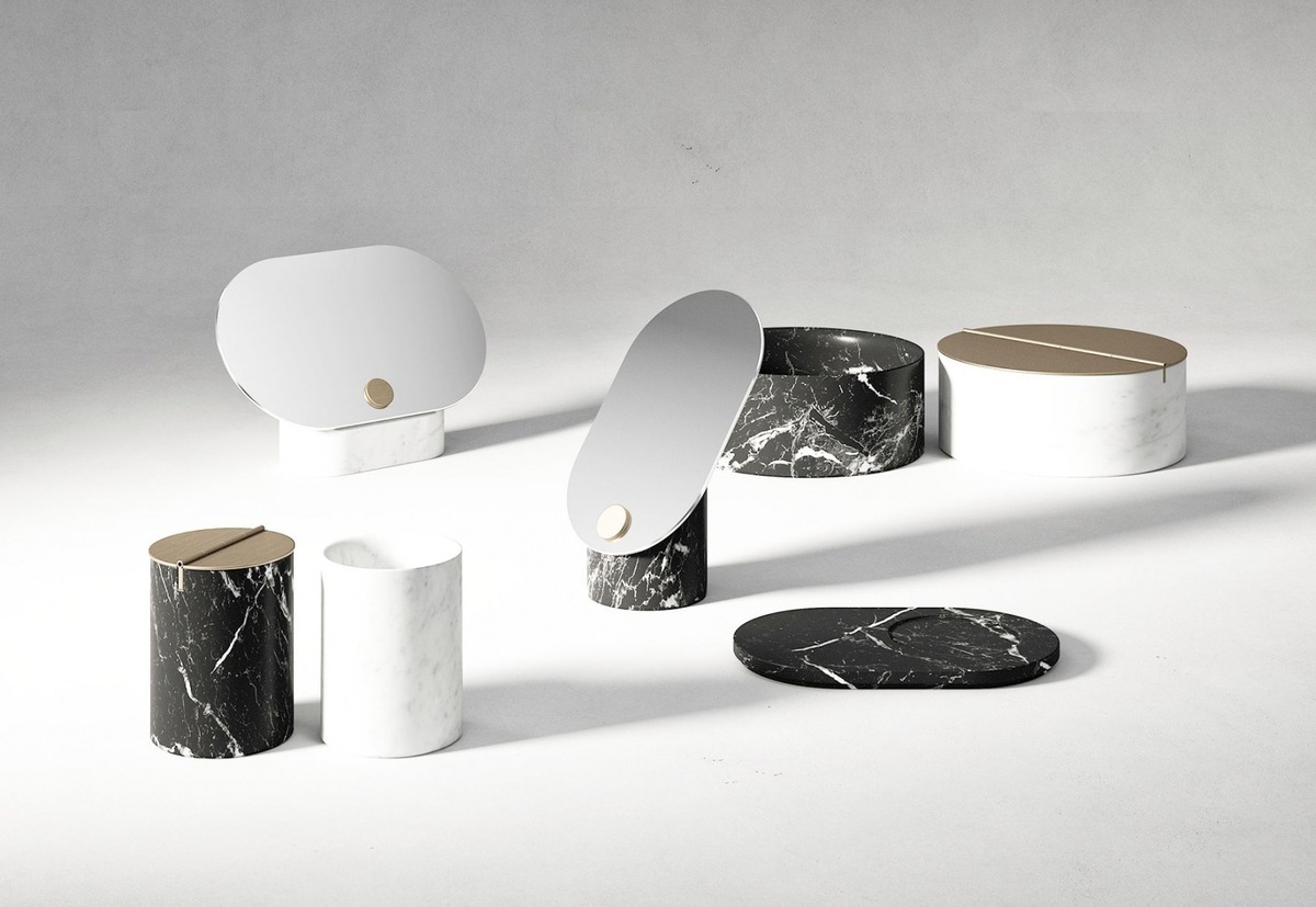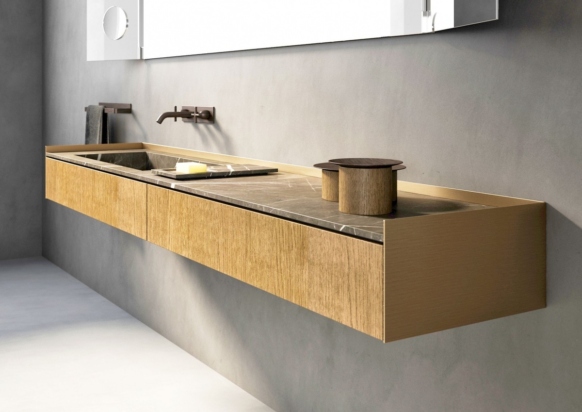 Rigo is bathroom furniture, inspired by designer Patricia Urquioloa. Two parallel rays intersect the wall and create a linear opportunity to place the wash basin and its accessories. The combination of marble, wood and anodized aluminium provides aesthetic and material wealth. The design provides a modern, minimalist and unconventional form of furniture.