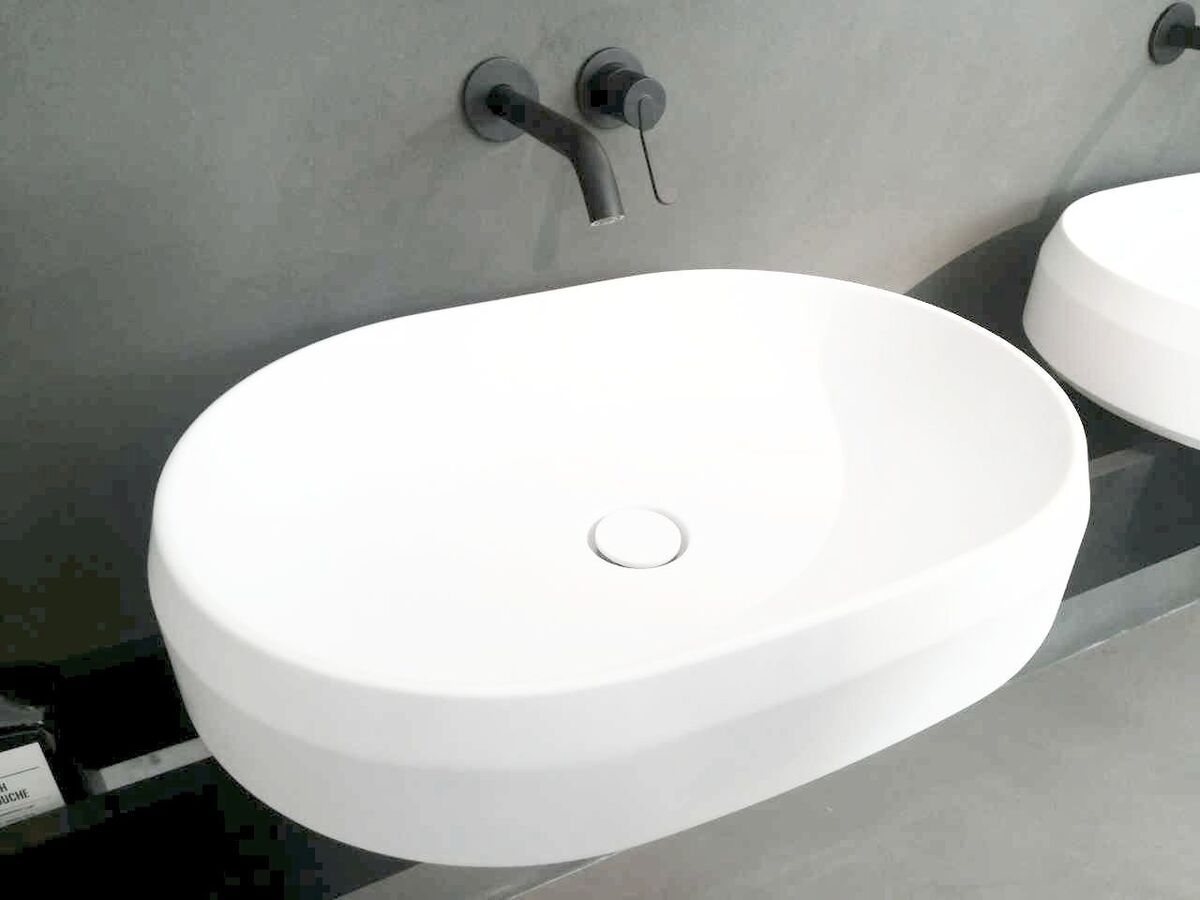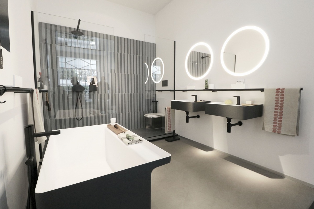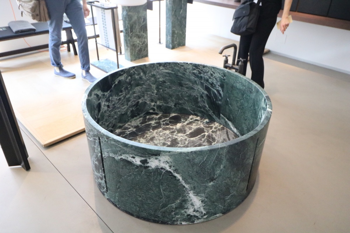 Lariana, which is a set of bathroom fittings, consisting of a bathtub and a washbasin, again designed by Patricia Urquiola. Our attention was also caught by green marble washbasins which luxuriously fit in with the bathroom interior. Whether it is the modern round shape, or a completely atypical, free-standing oval design.