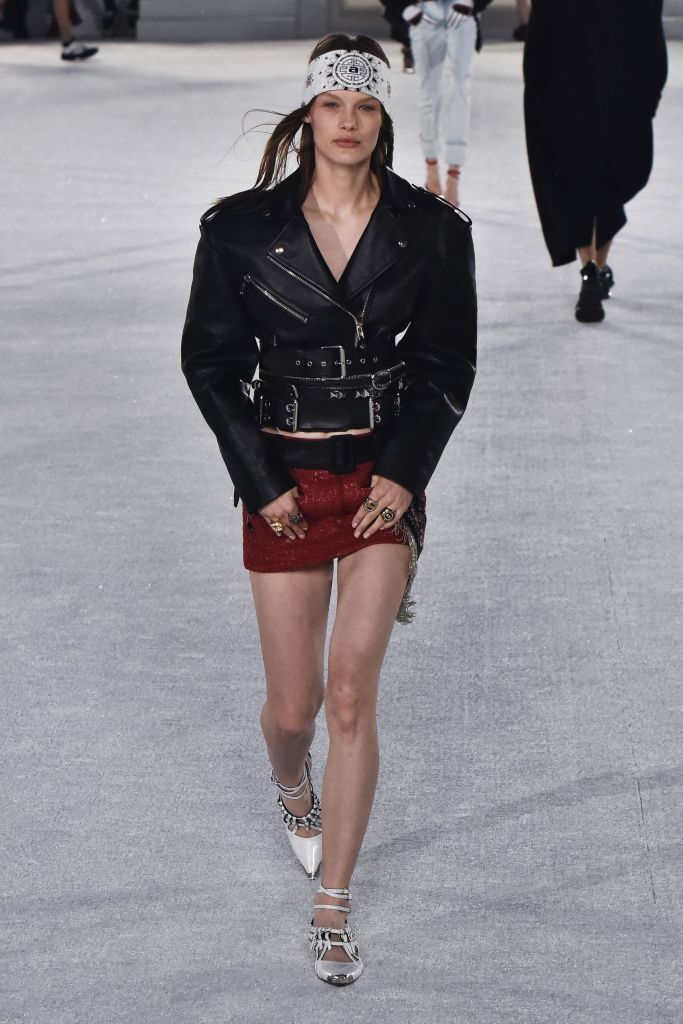 However, all this results in a mix of California (where Wang grew up) and China. This luckily makes the collection more interesting and I liked the model worn by Bella Hadid. She looks exactly like a Guns and Roses groupie. Leather shorts, a lace bra, cowboy necktie, denim jacket and enormous tennis shoes. Very sexy and lovely simultaneously! And the ideal choice for a summer rock festival