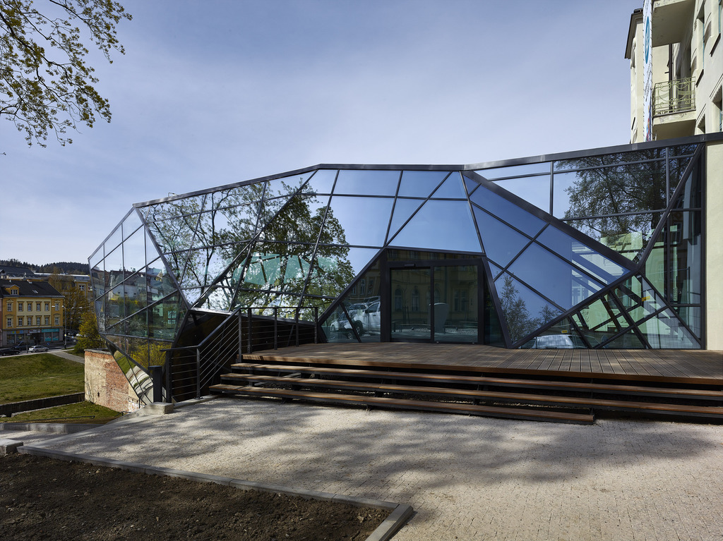 The three-storey cut crystal made of glass and steel has an all-glass façade. The top floor is used for short-term exhibitions or as a café, while downstairs there is an exhibition. According to the organizers of the competition, the new crystal has become a natural part of the environment.