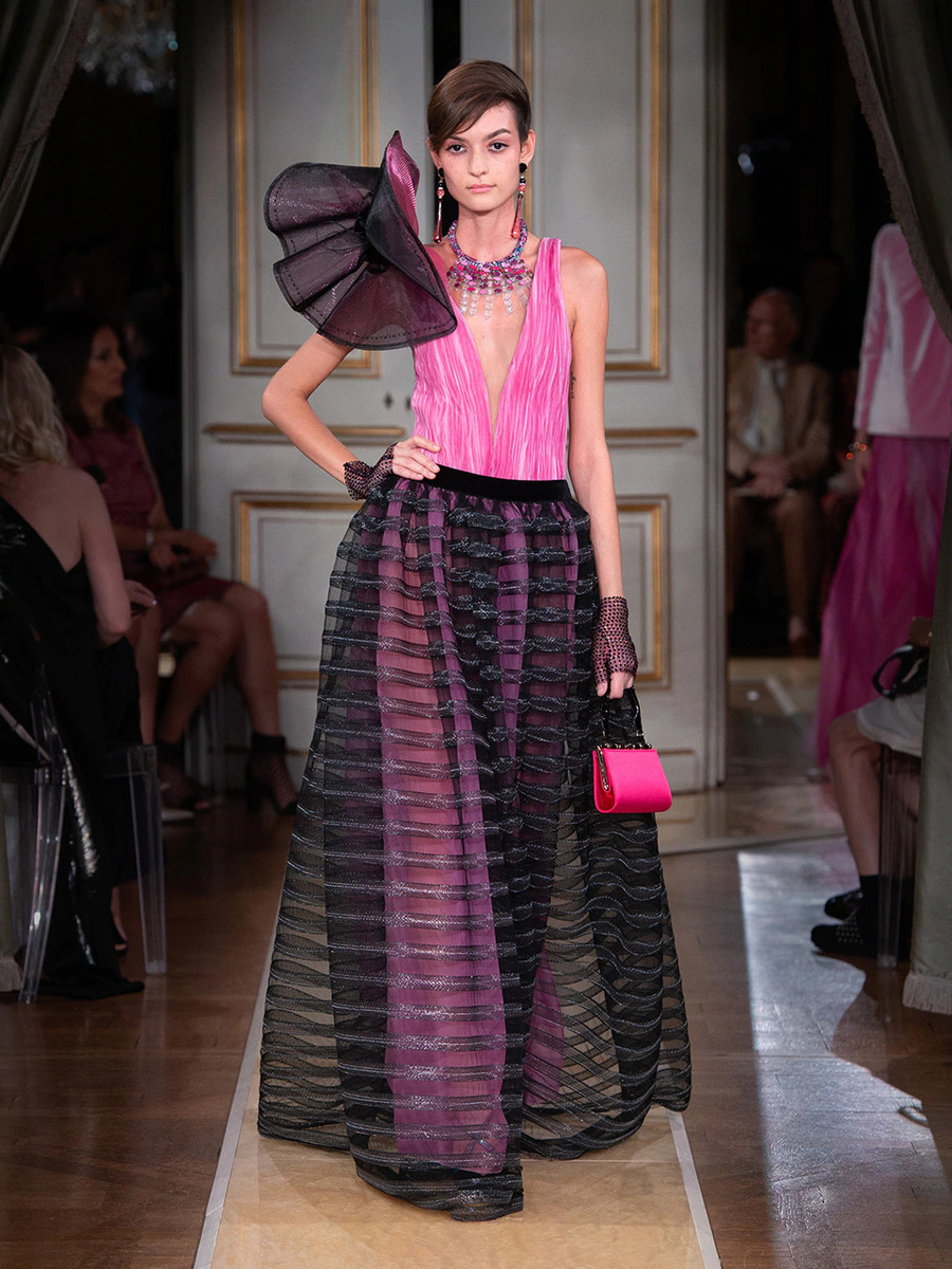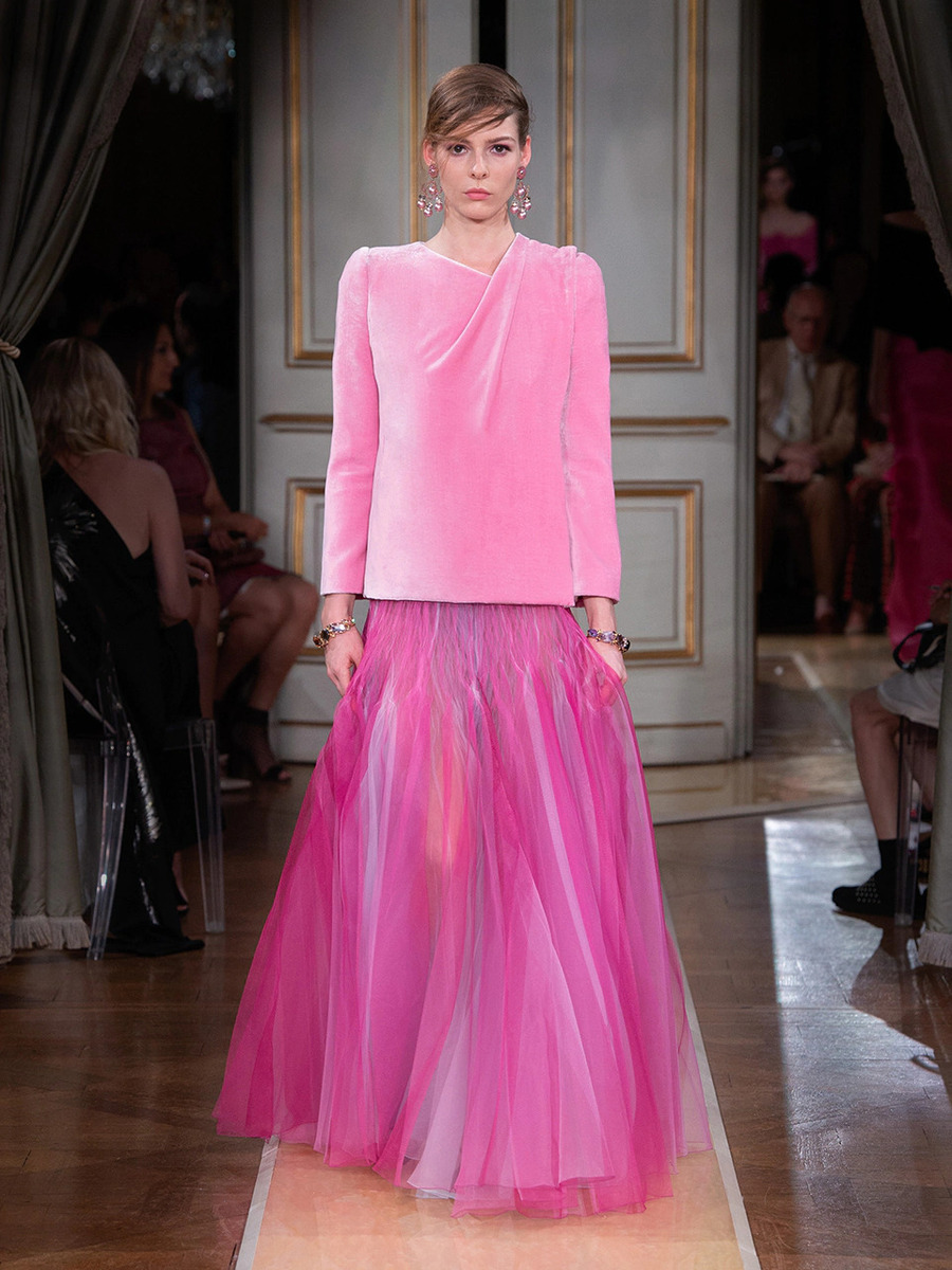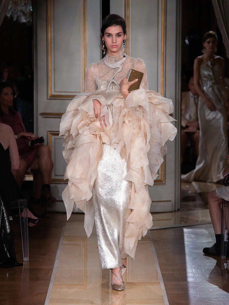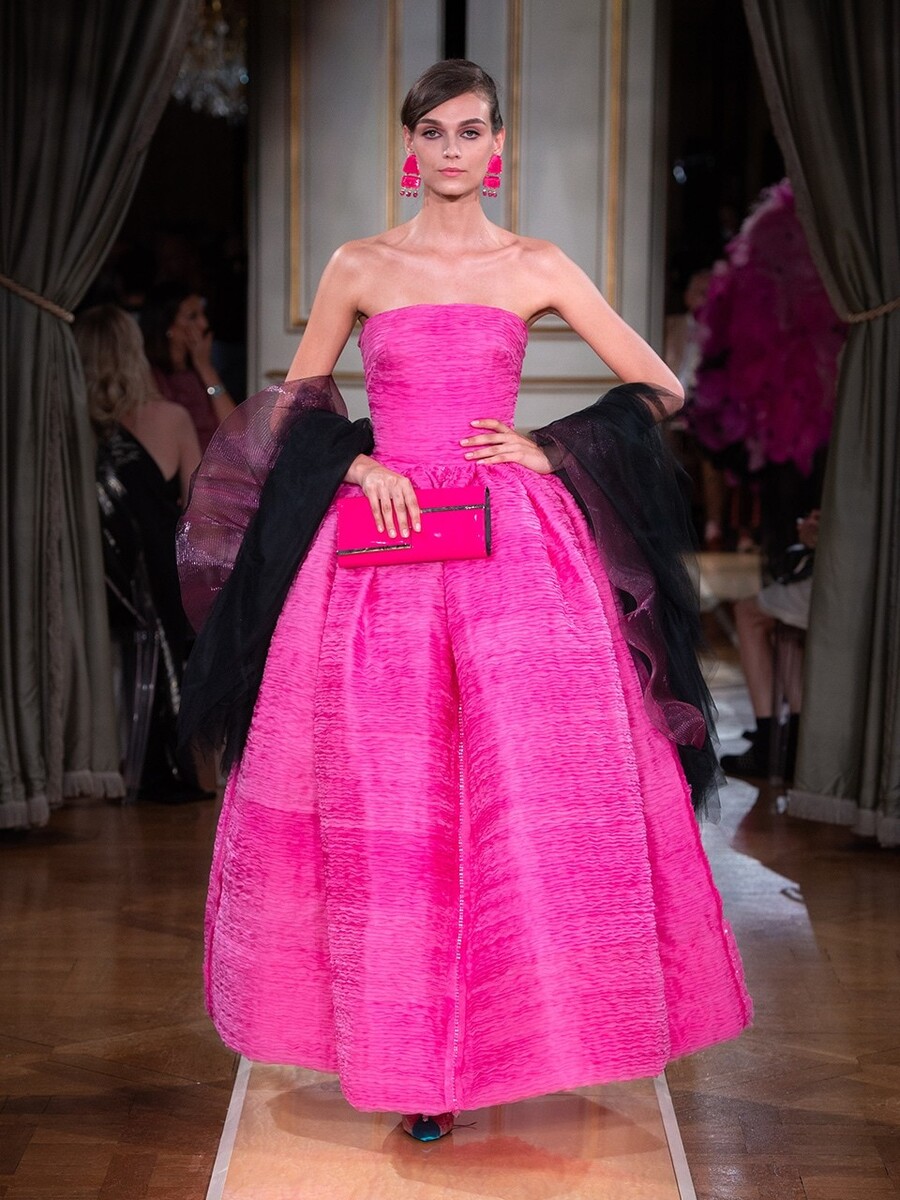 While haute couture SS 2018 consisted predominantly of mini dresses and suits of sky-blue colour, the AW 2018 is a parade of neutral tones in combination with bold pink and turquoise. You would be hard-pressed to find a mini skirt here, because the luxury collection of AW 2018 is full maxi volumes and great gowns.