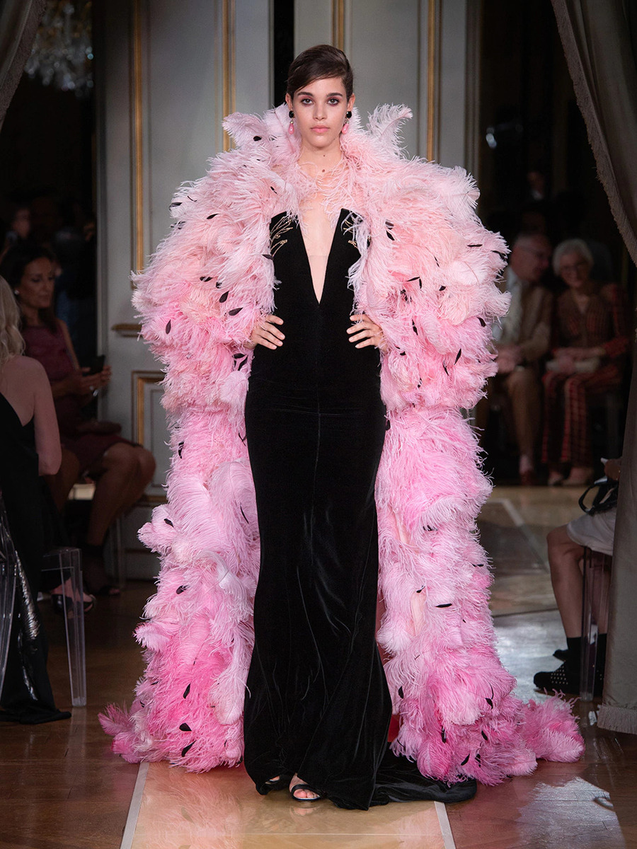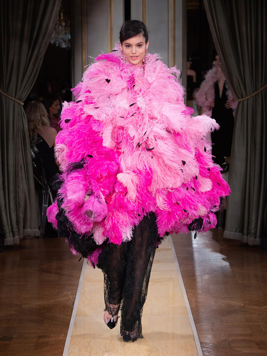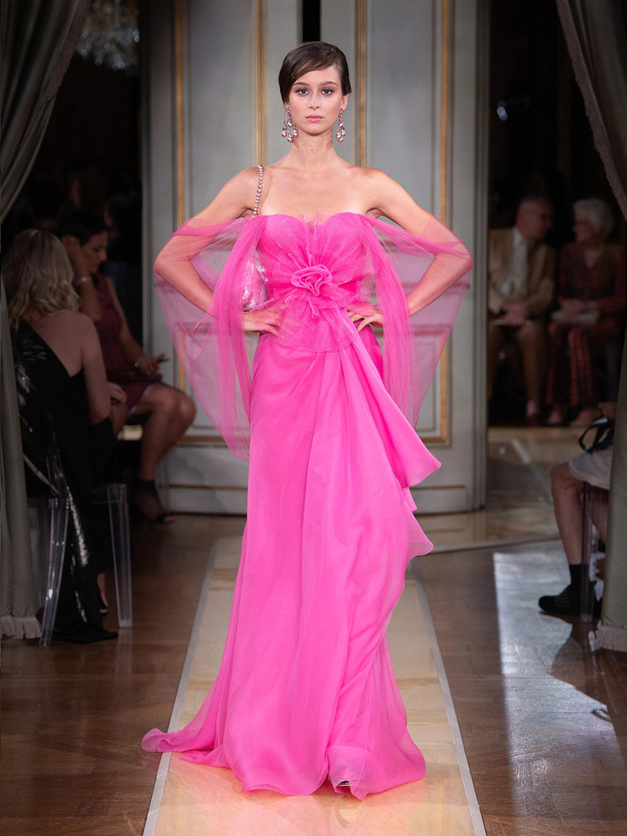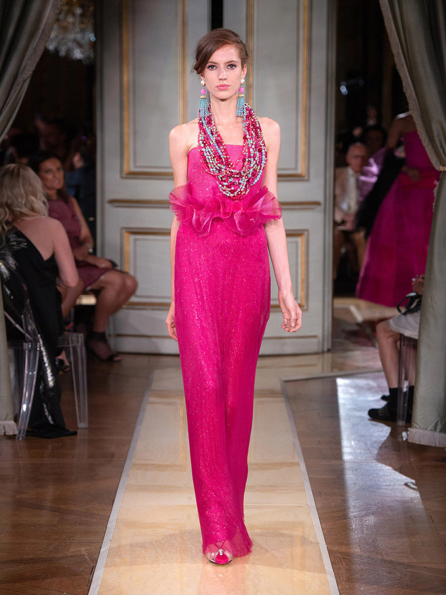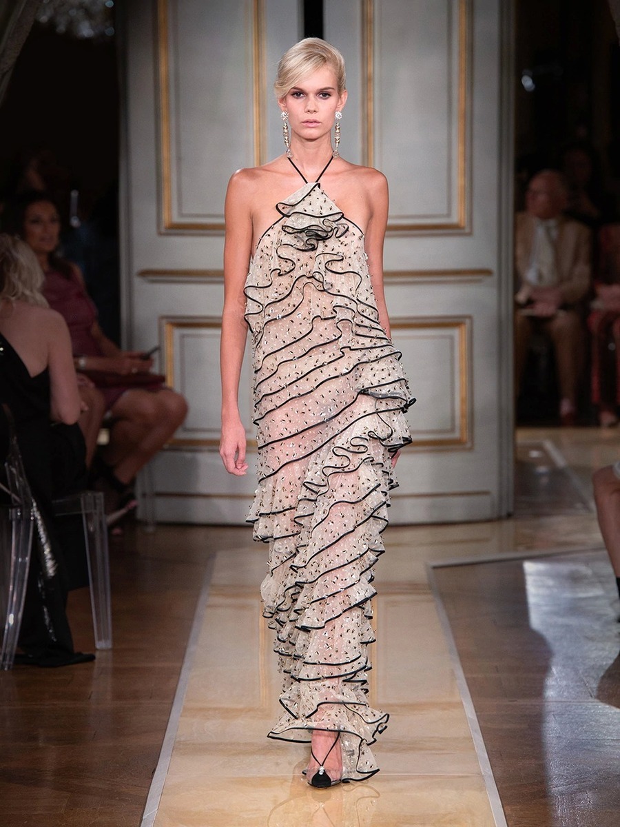 While haute couture SS 2018 consisted predominantly of mini dresses and suits of sky-blue colour, the AW 2018 is a parade of neutral tones in combination with bold pink and turquoise. You would be hard-pressed to find a mini skirt here, because the luxury collection of AW 2018 is full maxi volumes and great gowns.