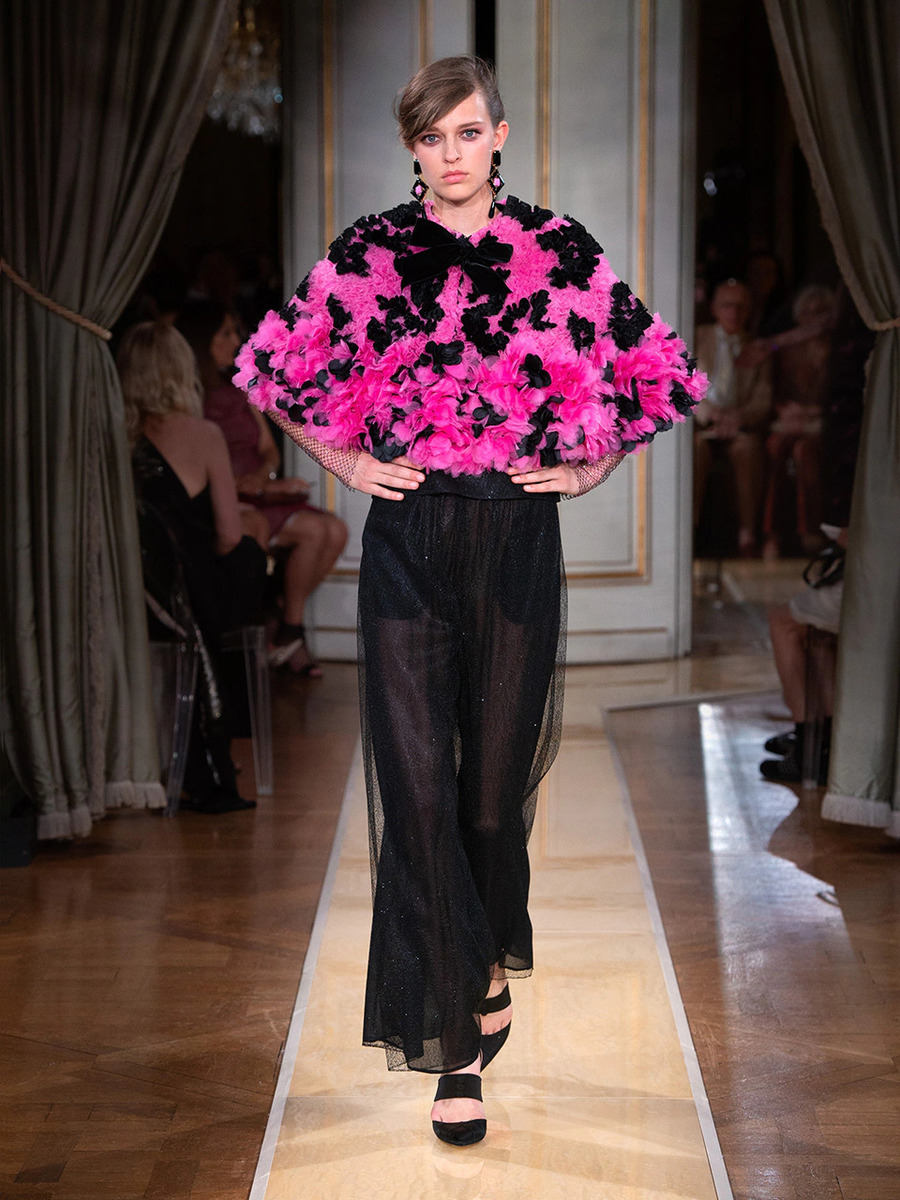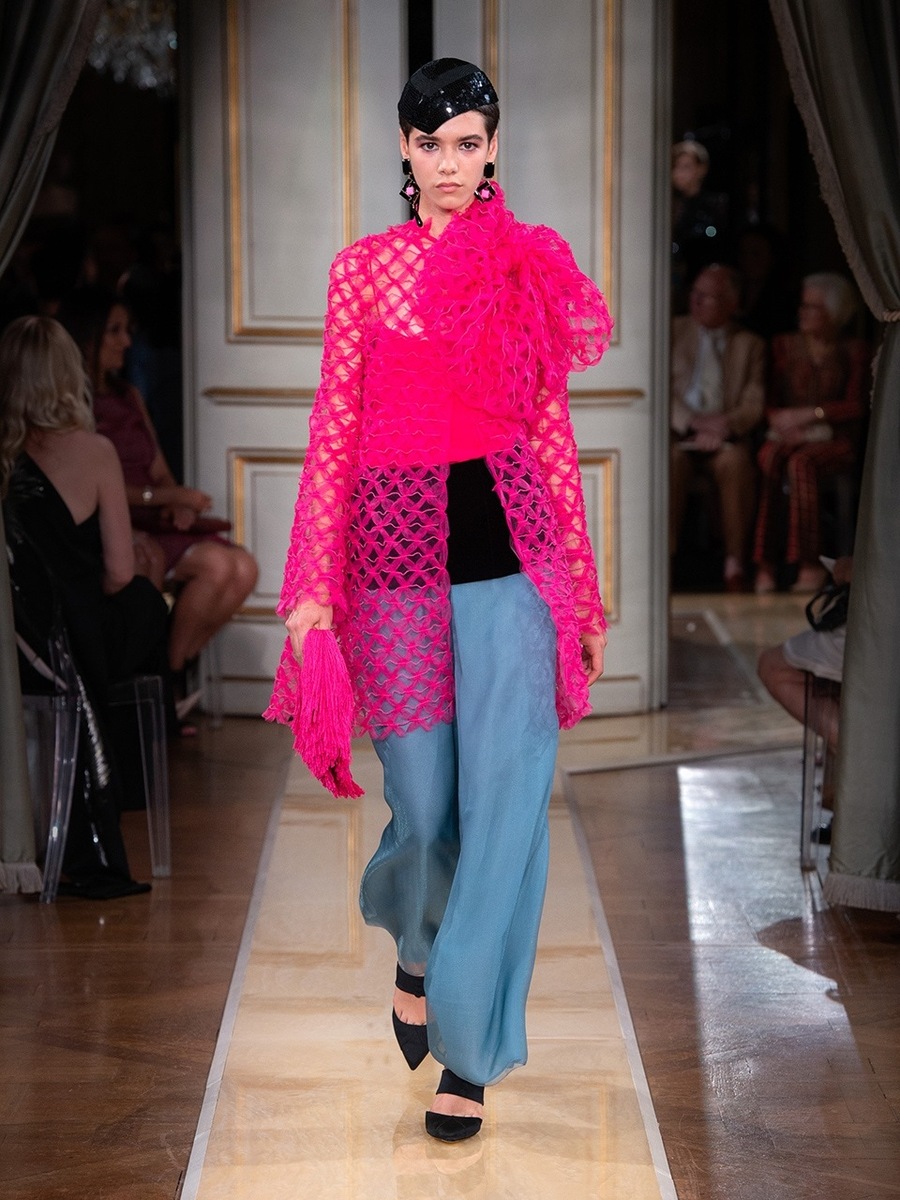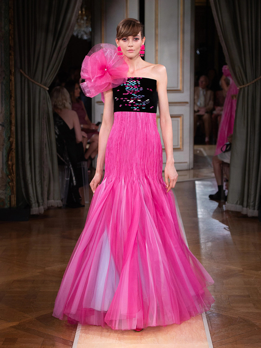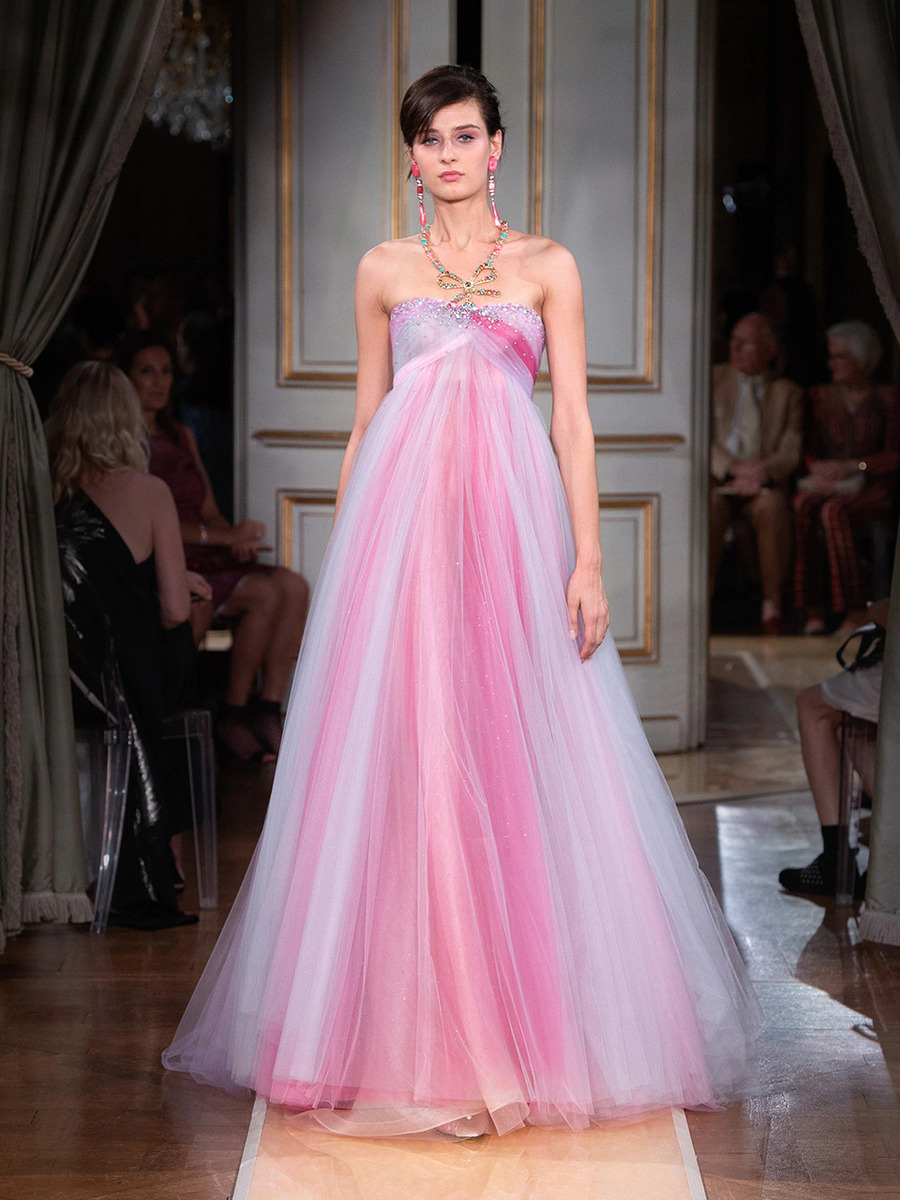 While haute couture SS 2018 consisted predominantly of mini dresses and suits of sky-blue colour, the AW 2018 is a parade of neutral tones in combination with bold pink and turquoise. You would be hard-pressed to find a mini skirt here, because the luxury collection of AW 2018 is full maxi volumes and great gowns.
