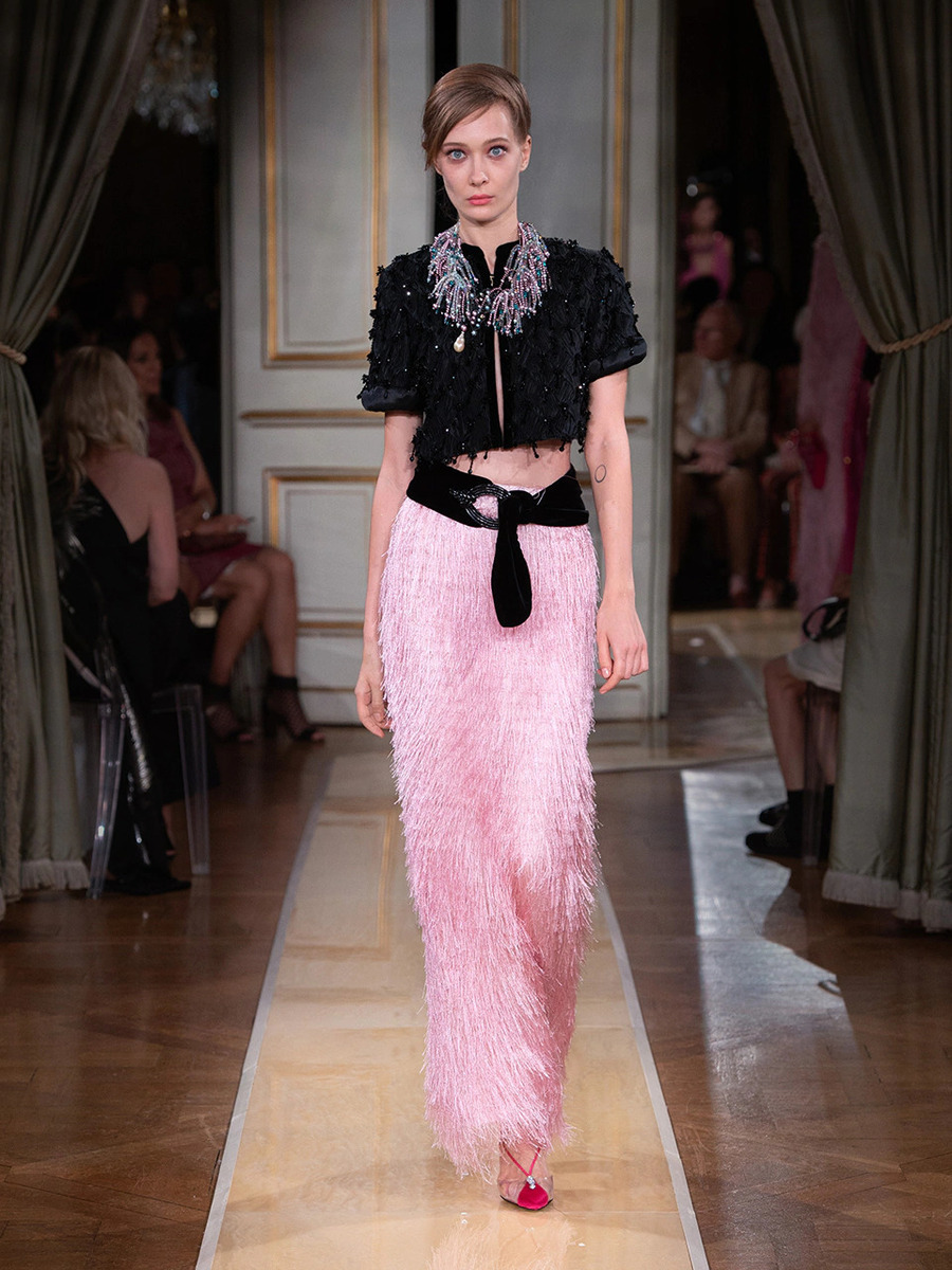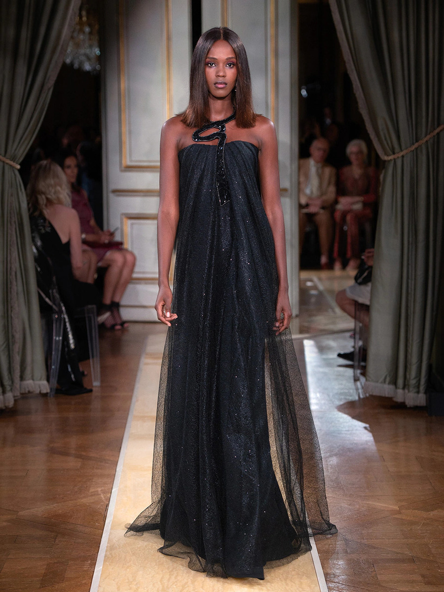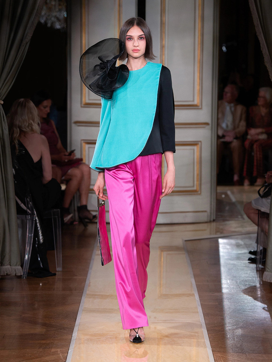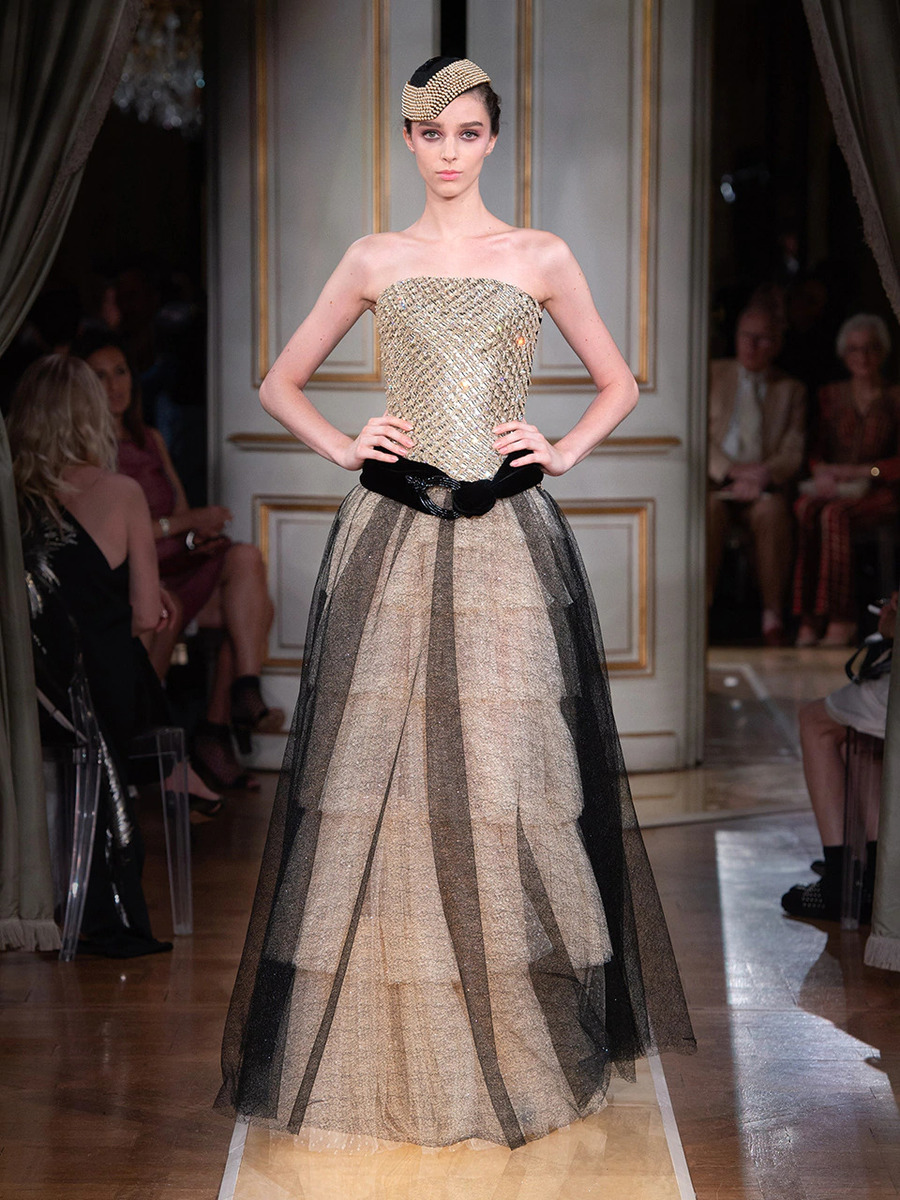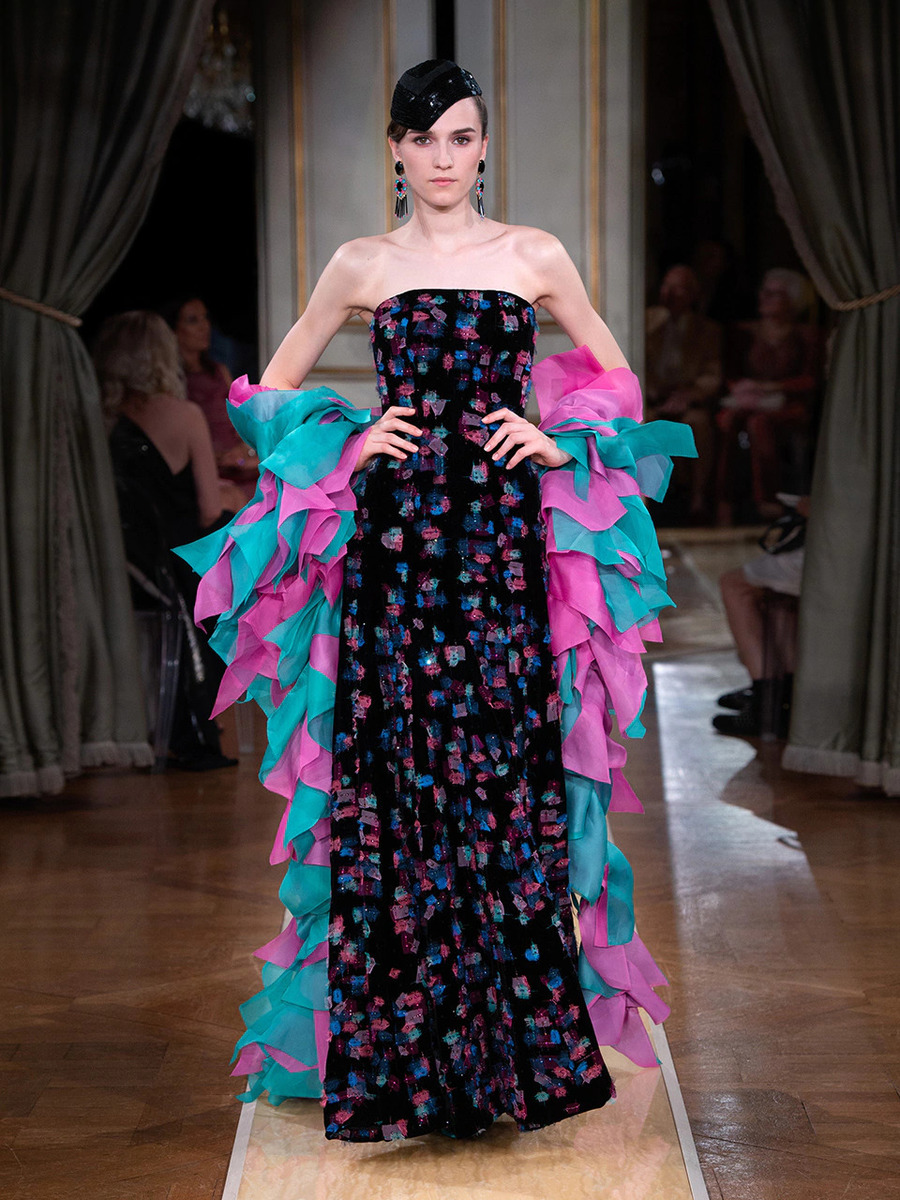 While haute couture SS 2018 consisted predominantly of mini dresses and suits of sky-blue colour, the AW 2018 is a parade of neutral tones in combination with bold pink and turquoise. You would be hard-pressed to find a mini skirt here, because the luxury collection of AW 2018 is full maxi volumes and great gowns.