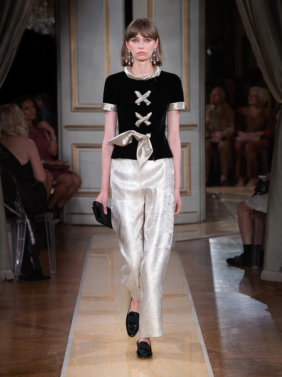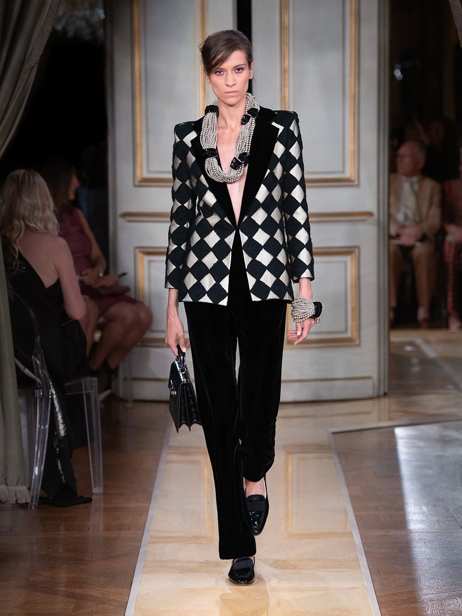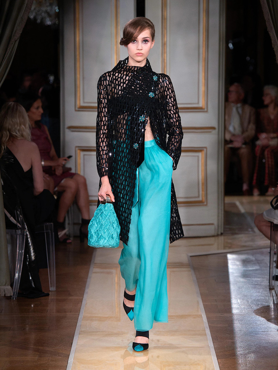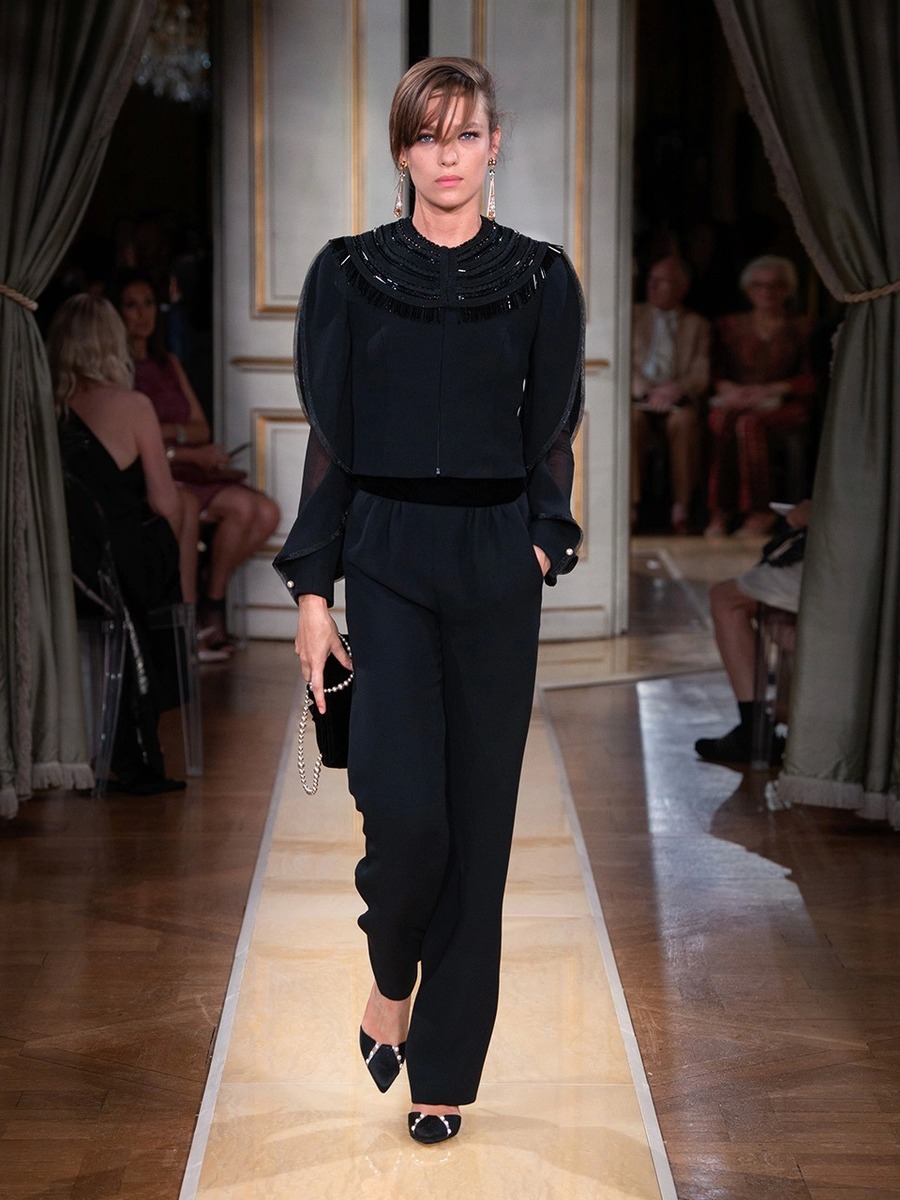 The Paris show was opened up by satin-finish suits in cream and earth tones. Fresh glamour look of the models was also achieved by luxurious tops, which sparkled under the sleek jackets, sophisticated cuts, bold embellishments and accessories. Giorgio Armani presented generous pearl necklaces and bracelets, daring hats and atypically-shaped handbags.