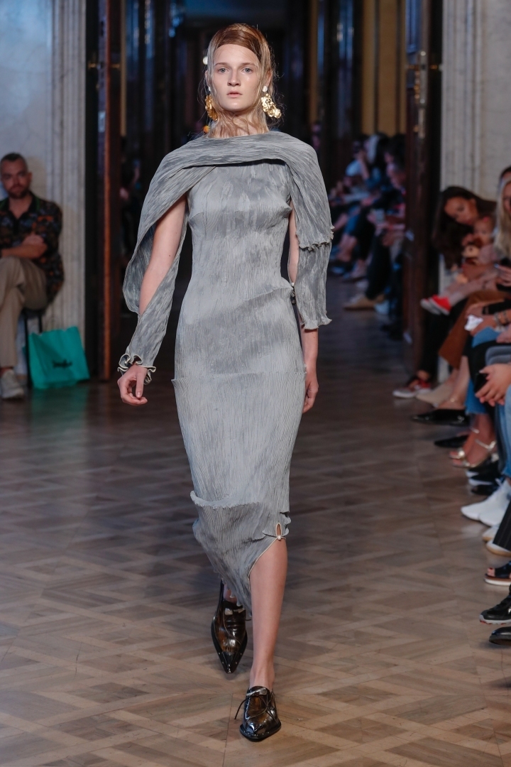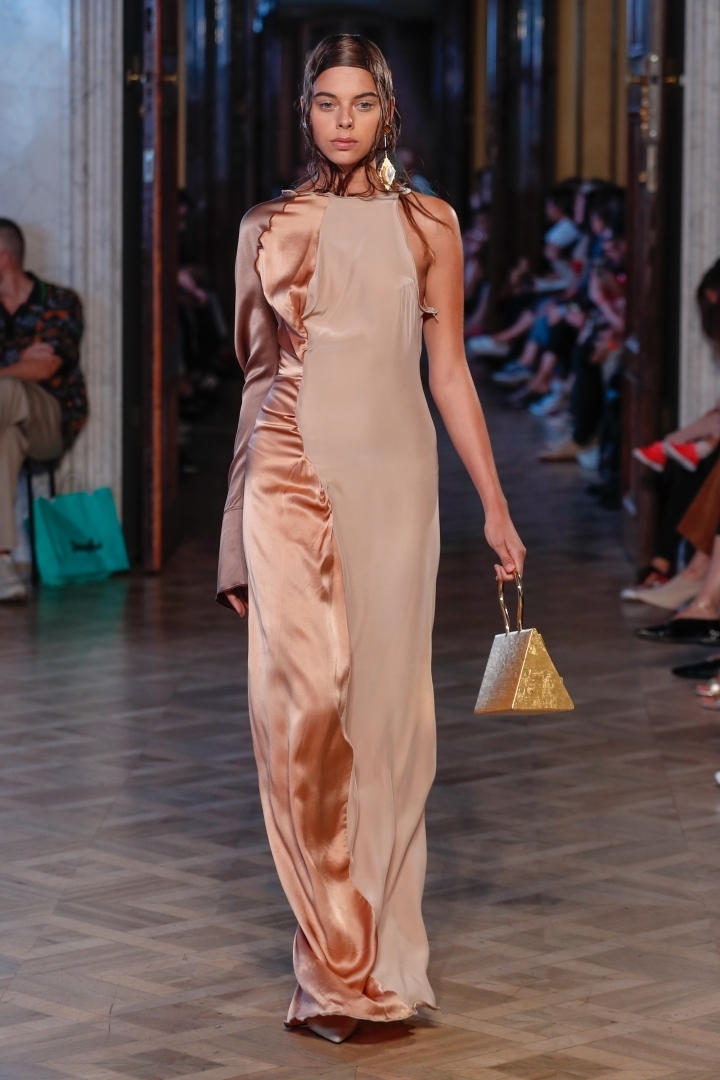 Young designer Lisa Konno presented a summer collection full of neon maxi models in shades of yellow, pink, orange, red and blue. Peet Dullaert stylised his models into a wet look. The minimalist midi and maxi outfits in gentle warm colours were accessorised with massive, luxurious jewels.