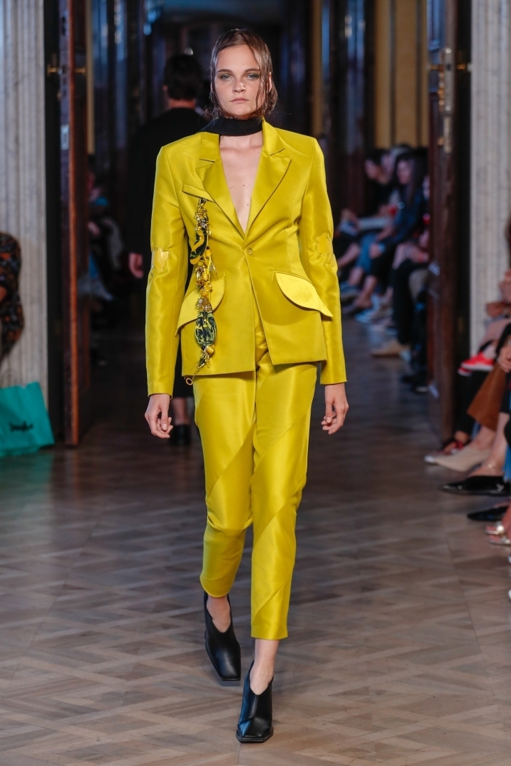 The dresses by Peet Dullaert were a pleasant surprise. I particularly like the aluminium grey one, which was super shiny and had a very interesting cut. It was unconventional, but I could easily imagine even the Duchess of Cambridge Kate Middleton wearing it. My other favourite was the trouser suit in sunny yellow with the cascading brooch by MARTAN. This outfit can be worn day or night. It’s simply irresistible!