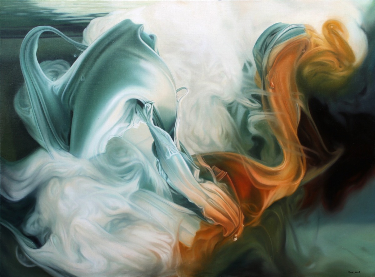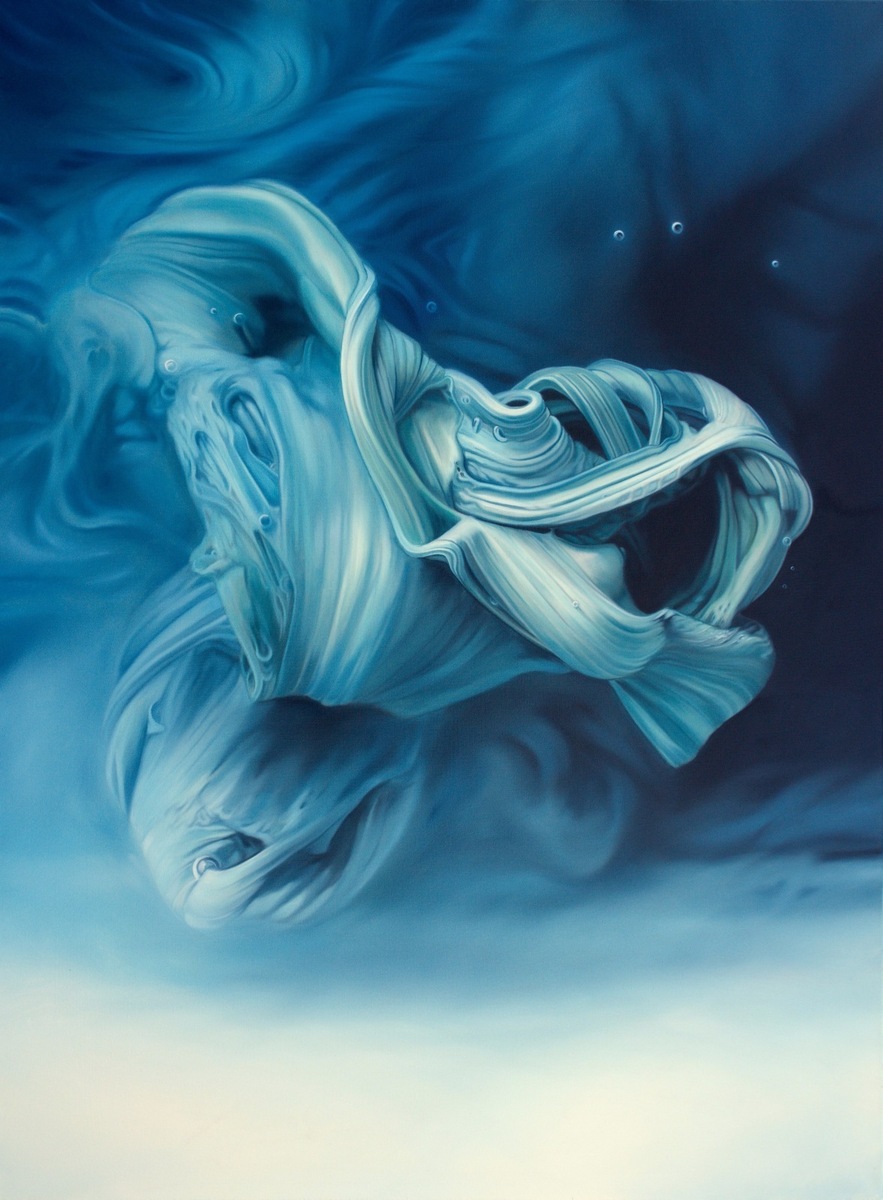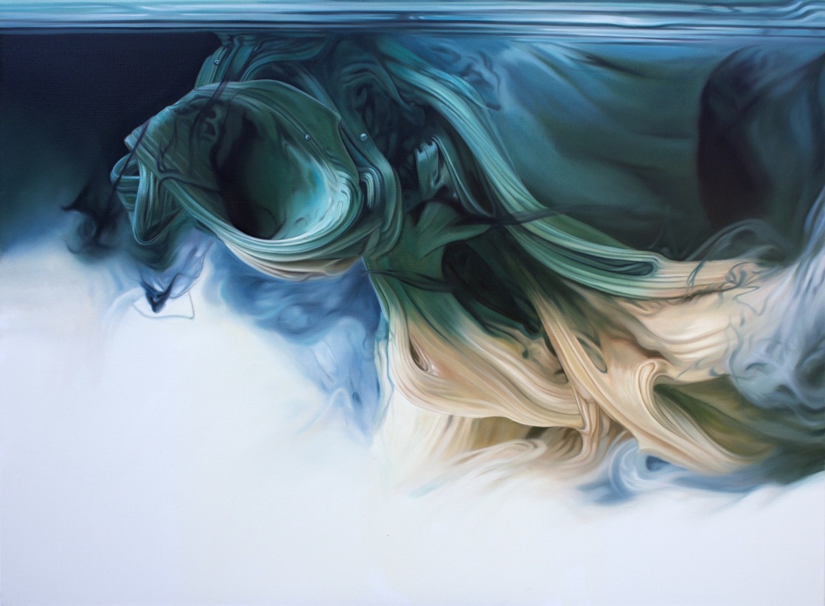 ‘I always start with a model. I model a basic motif, which I then photograph in different surroungings. Lately, the surrounding is an aquarium with water and inks. The environment in water changes quickly, therefore it’s important to capture the given moment with a camera. I easily make thousands of photographs, from which only one captures the idea I was looking for. Then I make one ore more trial sketches, and decide, whether the painting is a prospective one. The final step is to paint.’