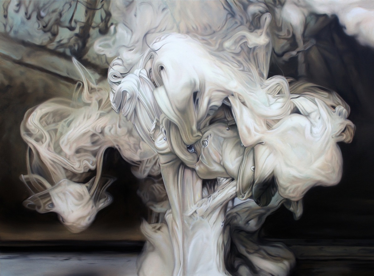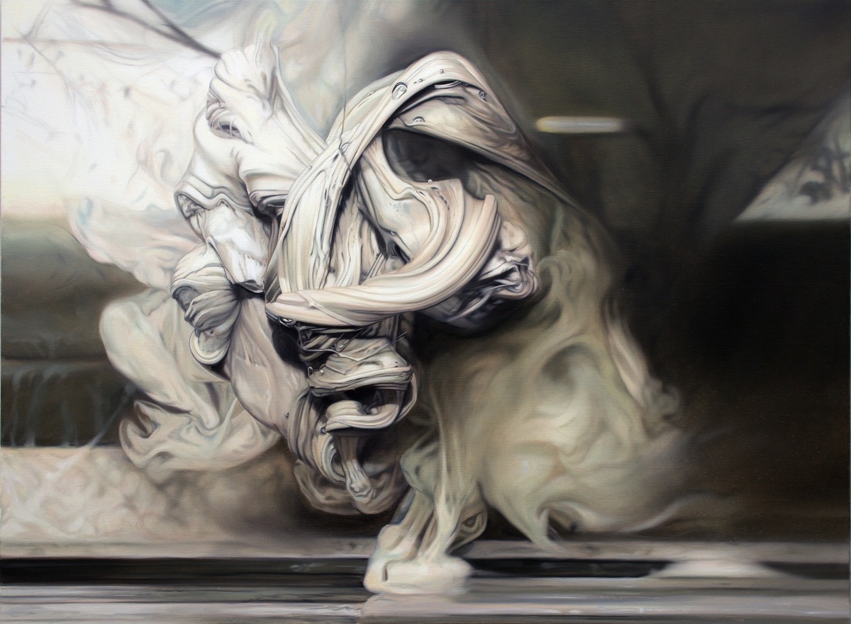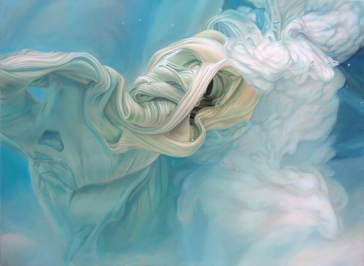 ‘I always start with a model. I model a basic motif, which I then photograph in different surroungings. Lately, the surrounding is an aquarium with water and inks. The environment in water changes quickly, therefore it’s important to capture the given moment with a camera. I easily make thousands of photographs, from which only one captures the idea I was looking for. Then I make one ore more trial sketches, and decide, whether the painting is a prospective one. The final step is to paint.’