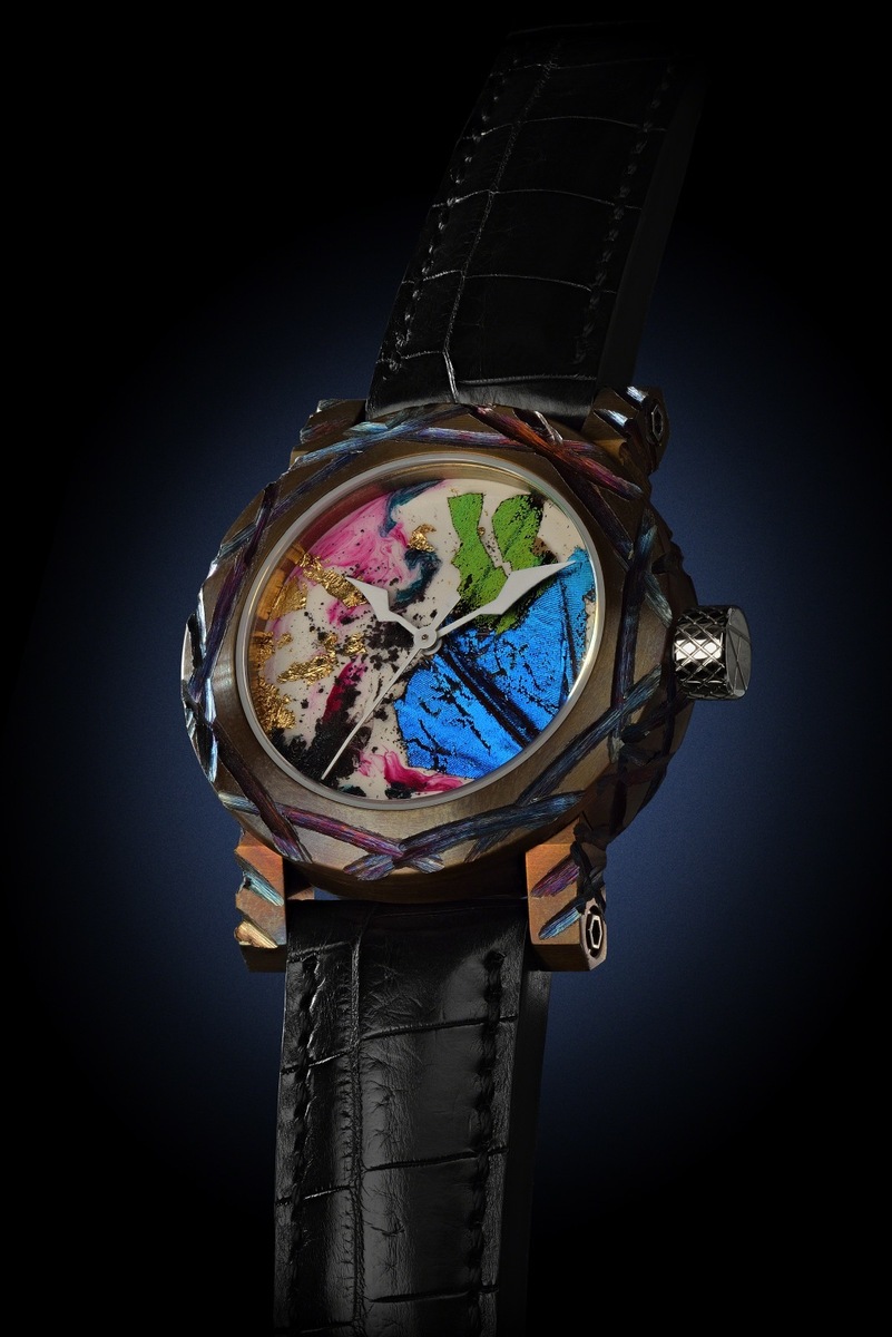 The handcrafted watch faces in this collection include the wings of tropical butterflies and their production makes use of natural pigments, tobacco leaves, gold leaf, spiders, fish scales, and of course, the artistic process itself - painting. These fabulous luxury models are the creation of the artist Dominique Arpa Cirpka, who has worked on them for a number of years.