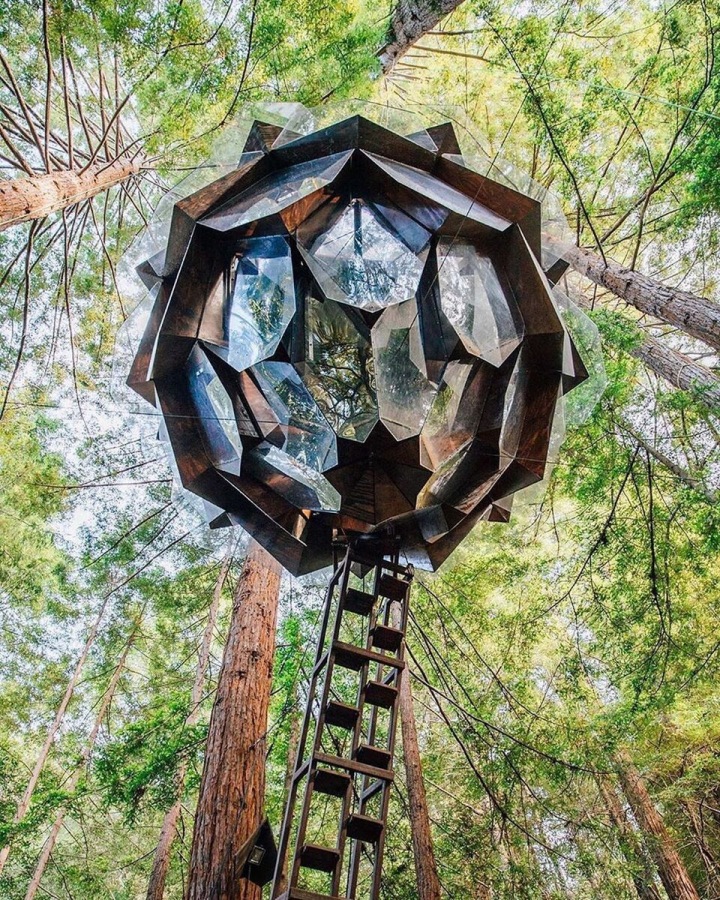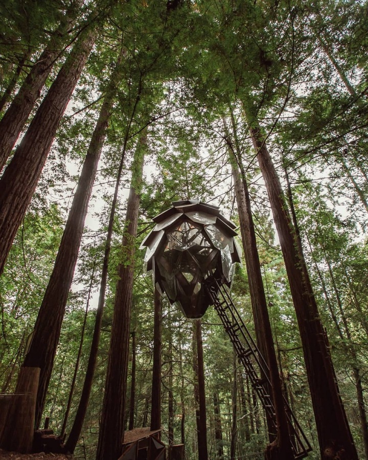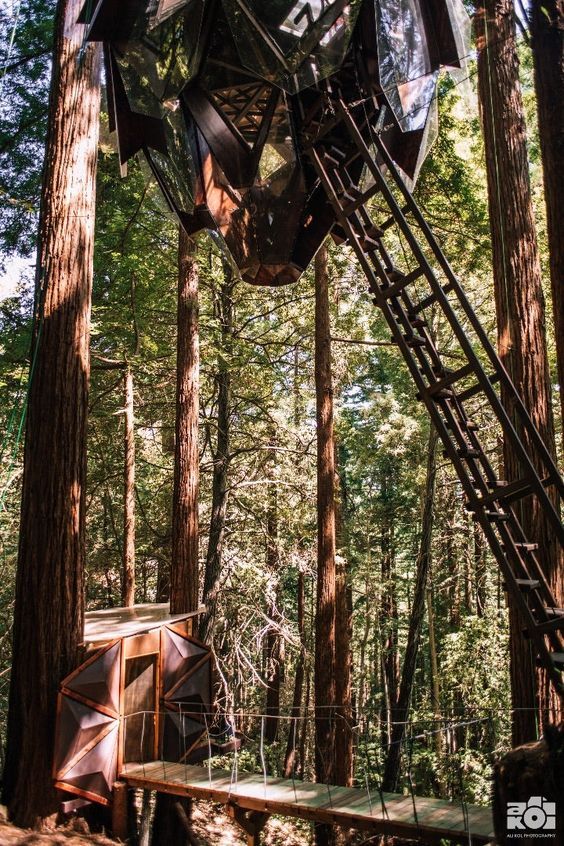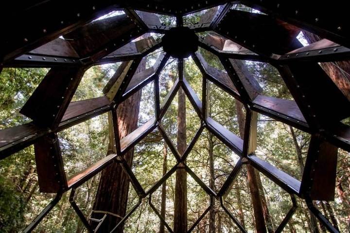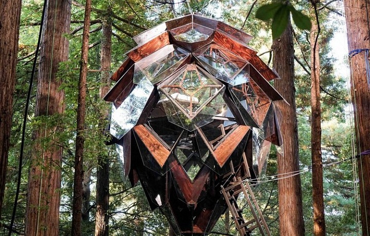 The house is fixed to the redwood trees from eight different points and thus is completely safe. It is primarily made of steel and a wooden structure framed by acrylic glass. As a result, the exterior gives the impression of crystal diamonds in the sun.