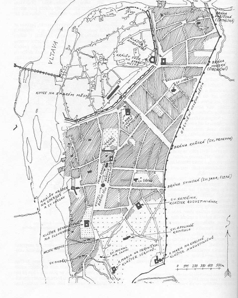 New Town was founded by Roman Emperor and King of Bohemia Charles IV. He wanted to elevate his seat to the greatest glory and endow it with all the important institutions of the time. His activity was guided by the ideal vision of making Prague the new metropolis of the empire – after Rome, Constantinople and the papal city of Avignon. Medieval cities at the time had narrow, crooked street. For the newly established New Town, very wide avenues were designed, connecting together three marketplaces. It was a spectacular project at the time. Charles IV strove to decorate New Town with lavish representative buildings, consisting mainly of cathedrals and monastery compounds.