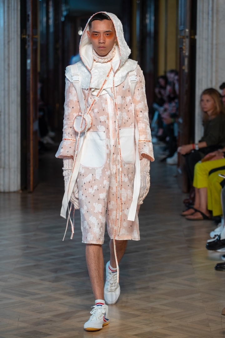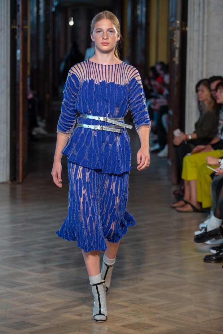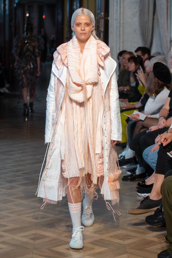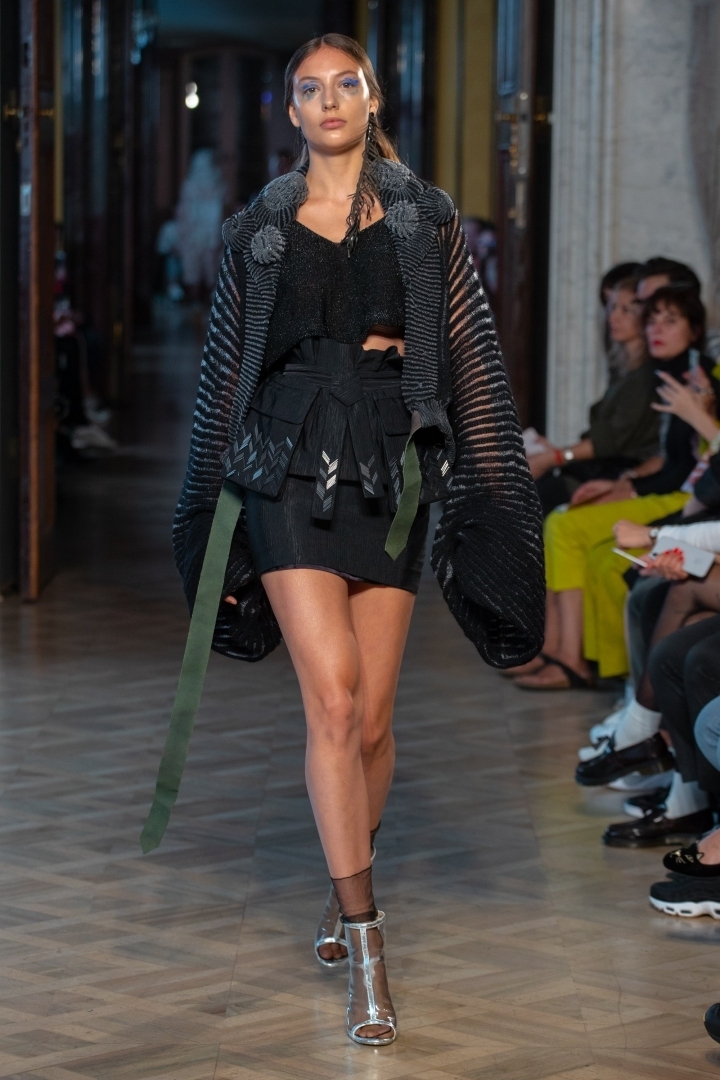 The model that made an impression on me at first glance was composed of an oversize semi-sheer pullover with pompoms, a short black top, a pleated skirt with a decorative wrap around the waist and the whole was accompanied by a pair of transparent ankle high heels. A business meeting, a cup of coffee with a girlfriend or a family get-together? This is simply perfect for any such occasion. In my opinion it is perfect and chic!