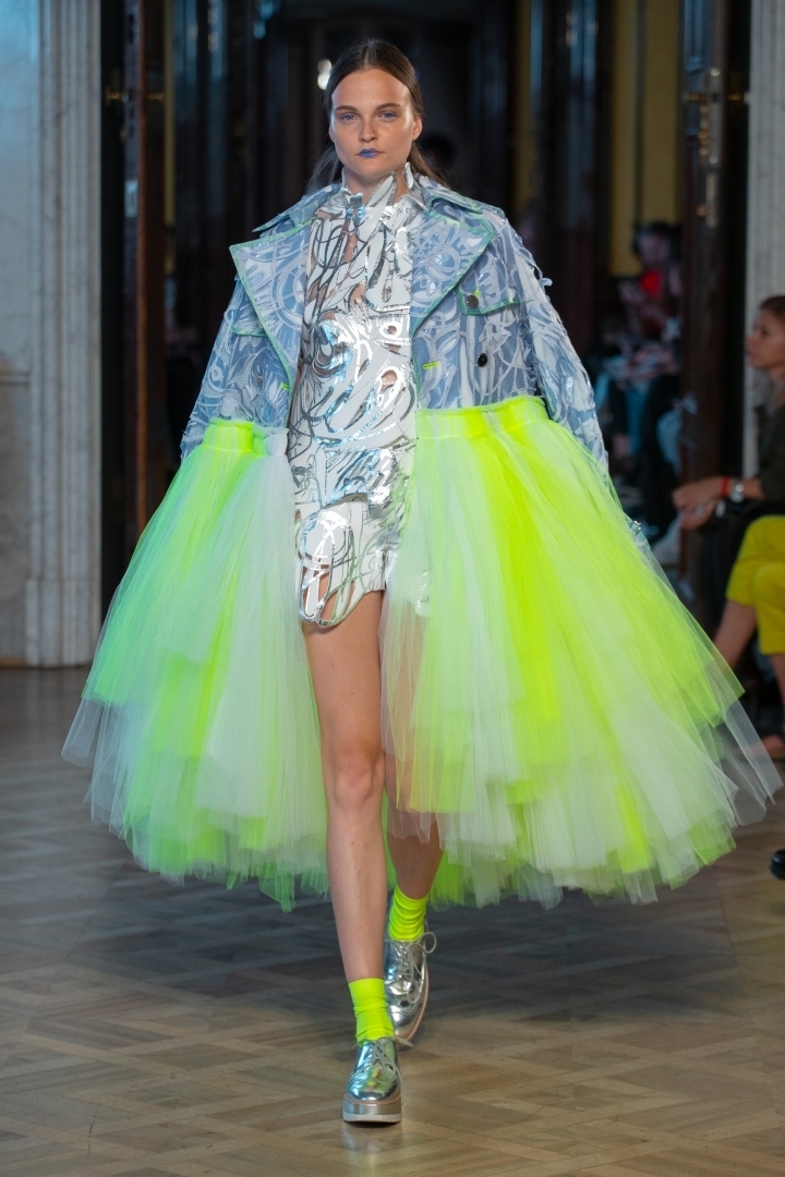 But let´s go back to the collection itself. The models did not skimp on colours, transparency but also sleeker, purely women's materials, such as tulle. In combination with the novel, in places cut-out white-golden jacket, the BFGU students created luxury designer clothing. Most of all, our attention was caught by this already mentioned material with cut-out details and a magnificent optical effect reminiscent of luxurious "graffiti". The creators gave it a real zest by cut-out parts, looking like a play with illusion. Something should be seen and something hidden.
