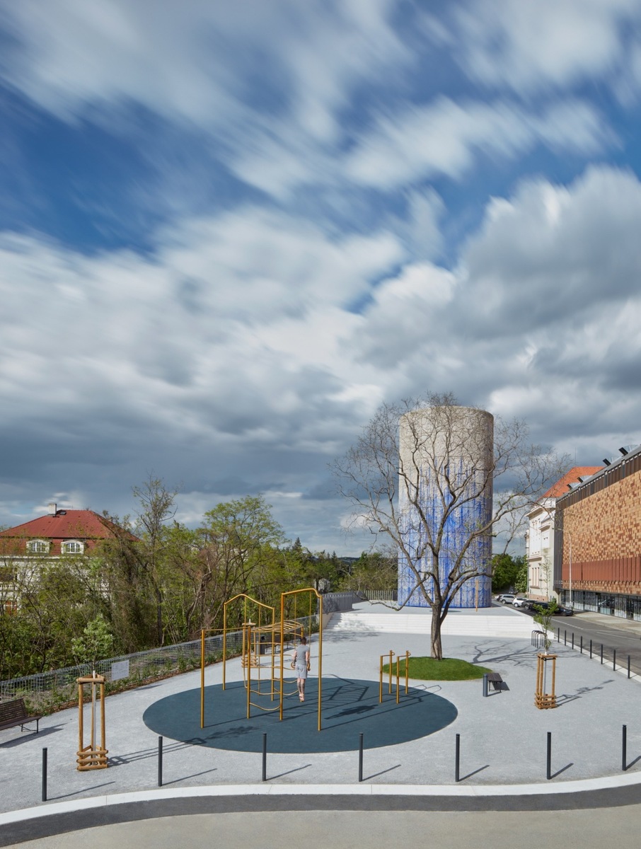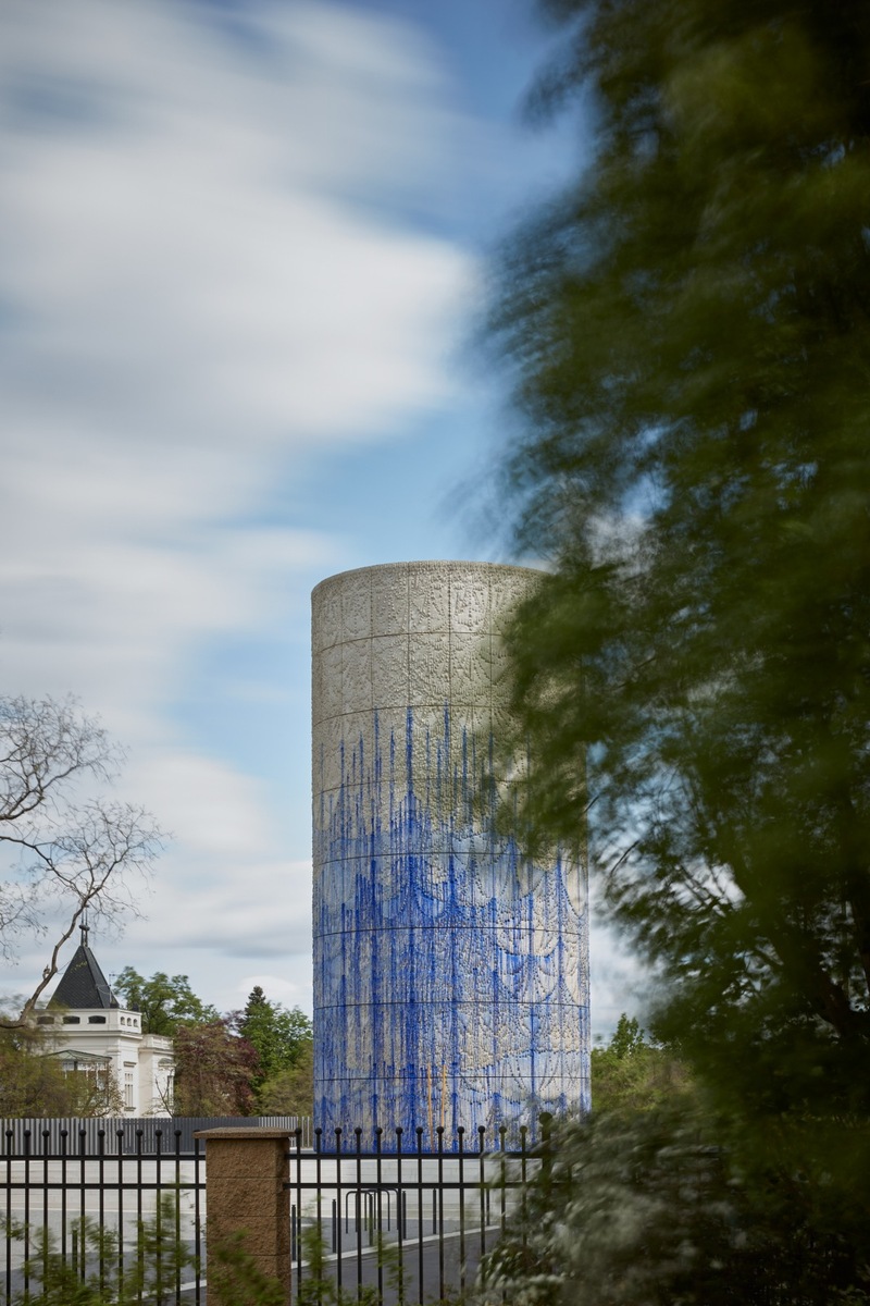 Diaz covered the chimney with plaques with plastic heraldic motifs. The relief was created by means of an ABB robotic arm. Prague 7 can thus boast of a truly unique artwork.