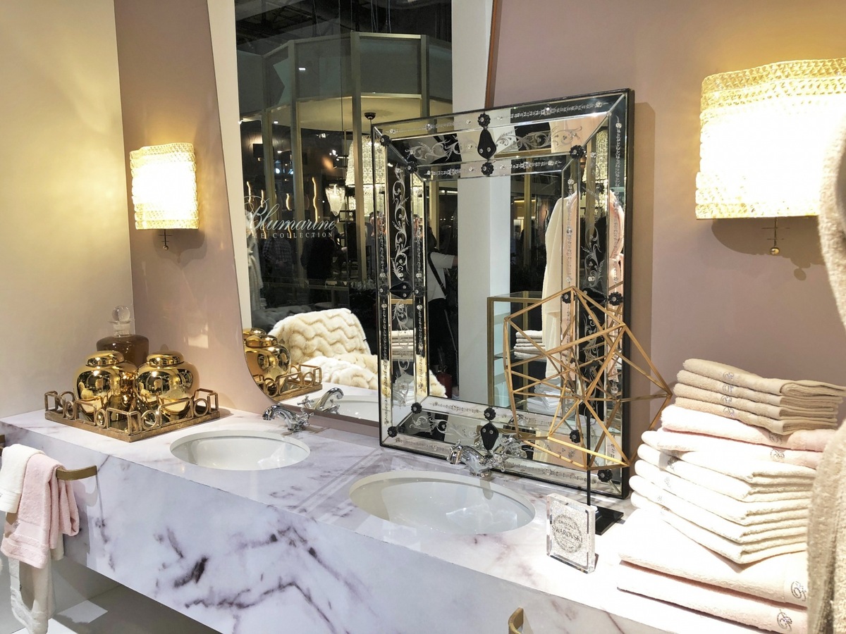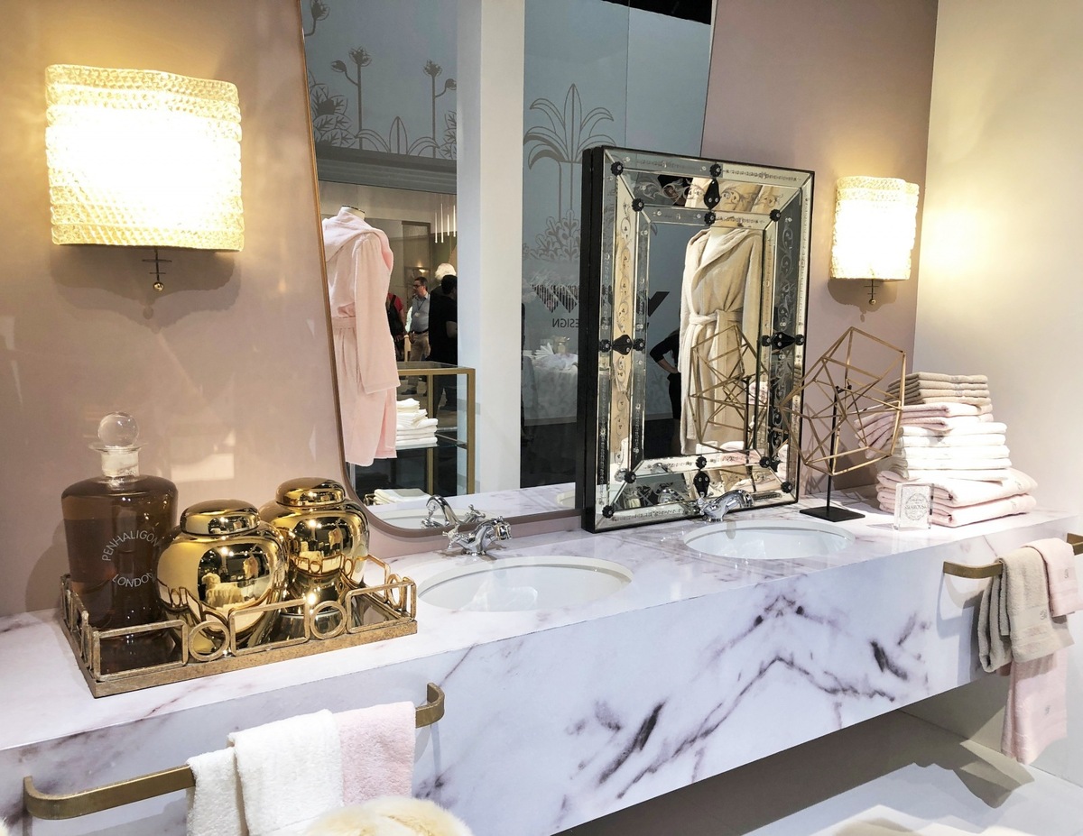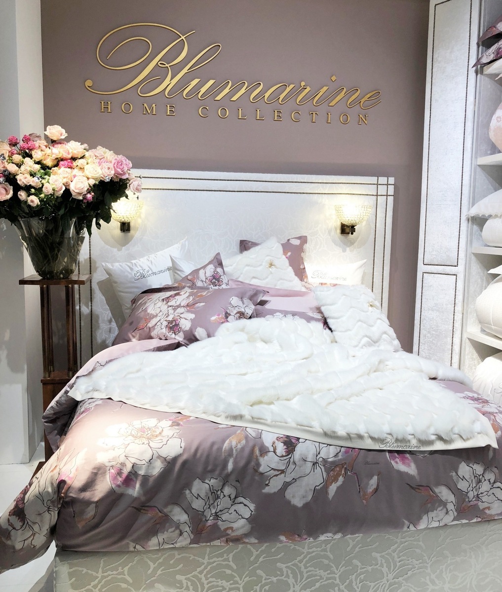 At the prestigious trade fair, Anna Molinari features her collection of luxury bedding in a romantic spirit and a combination of white and light purple. Beautiful flowers, naturally roses, make up the decoration also on a table set in a subtle ladies style. Luxurious bathrobes (in white and pink) and soft towels are the stars in an improvised bathroom.