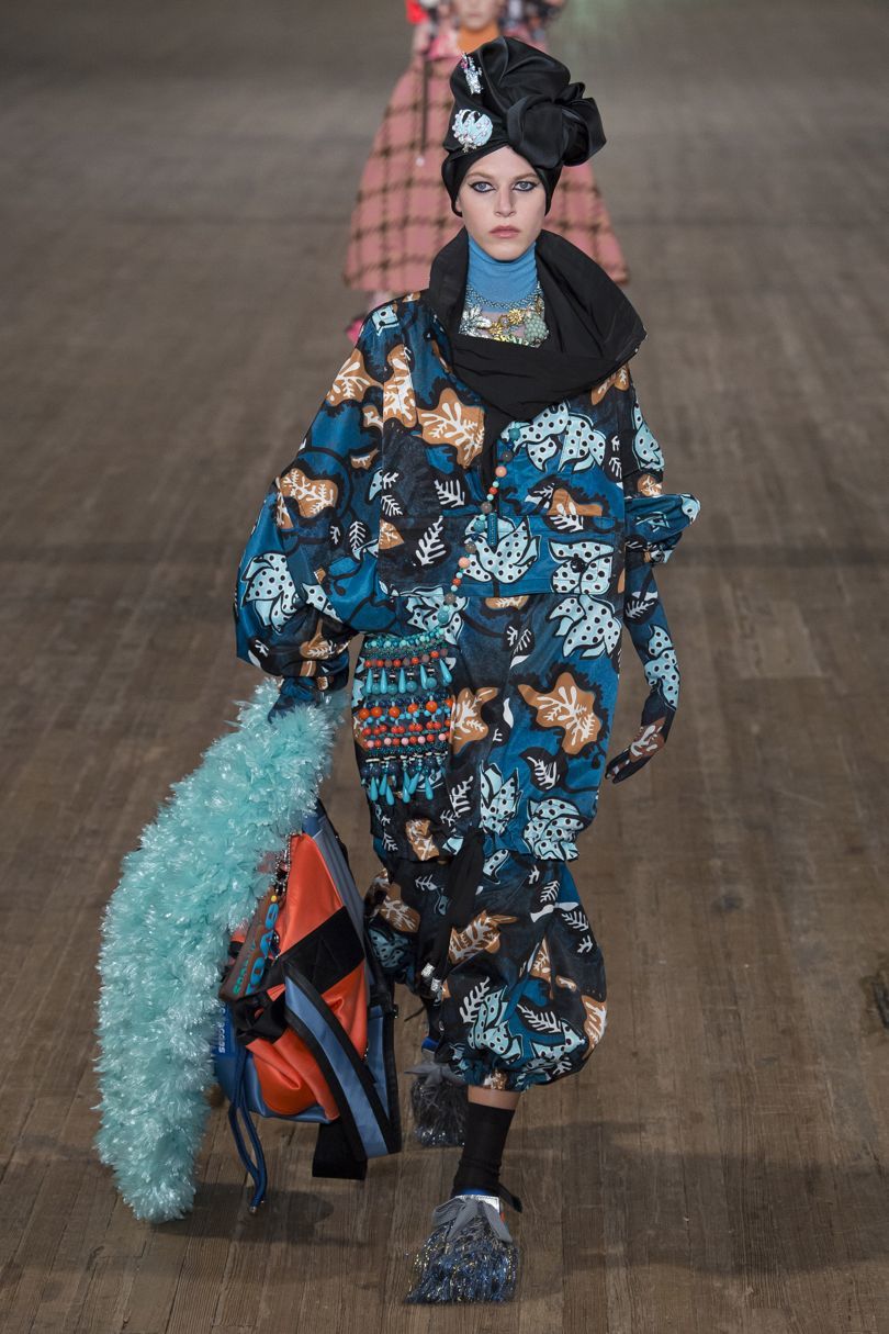The whole show was dominated by oversized clothing in a myriad of colours, large bum-bags, luxurious combinations of colours, materials and large patterns. Dresses with a belt and ruffling, long sequined skirts, suits, oversize sports jackets, overalls and headscarves in a myriad of versions and colours.