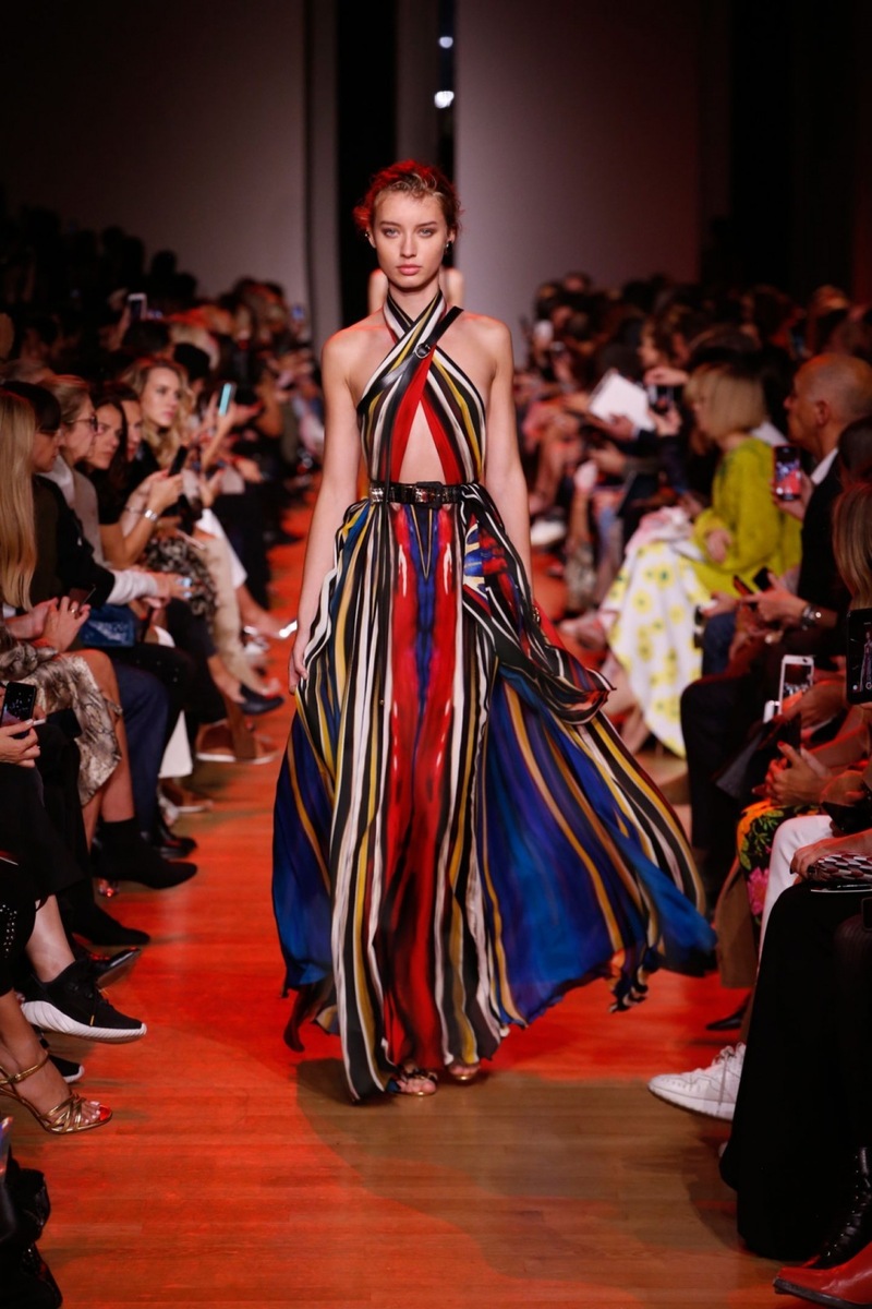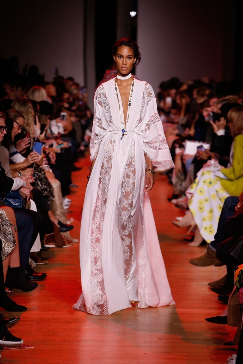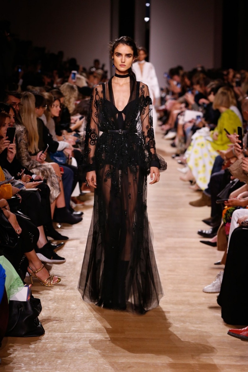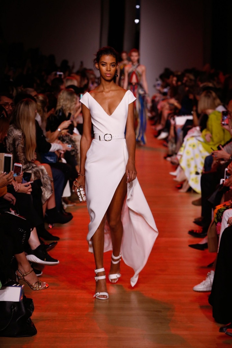 Elie Saab opened up his fashion show by a flood of white models, subsequently replaced by a wave of flowers, lace, stripes and bold designs. The luxury collection of SS19 displays a whole range of colours, clearly dominated by timeless black.