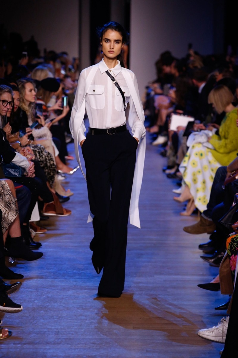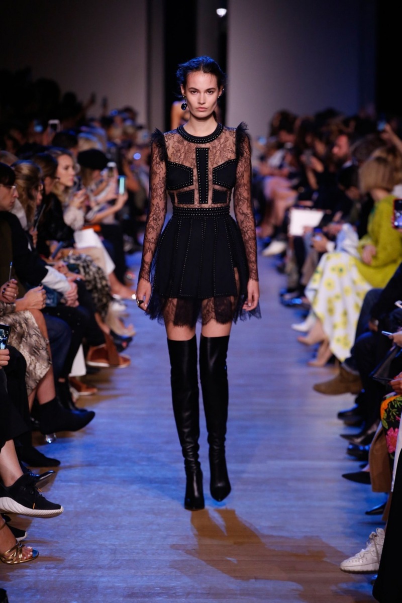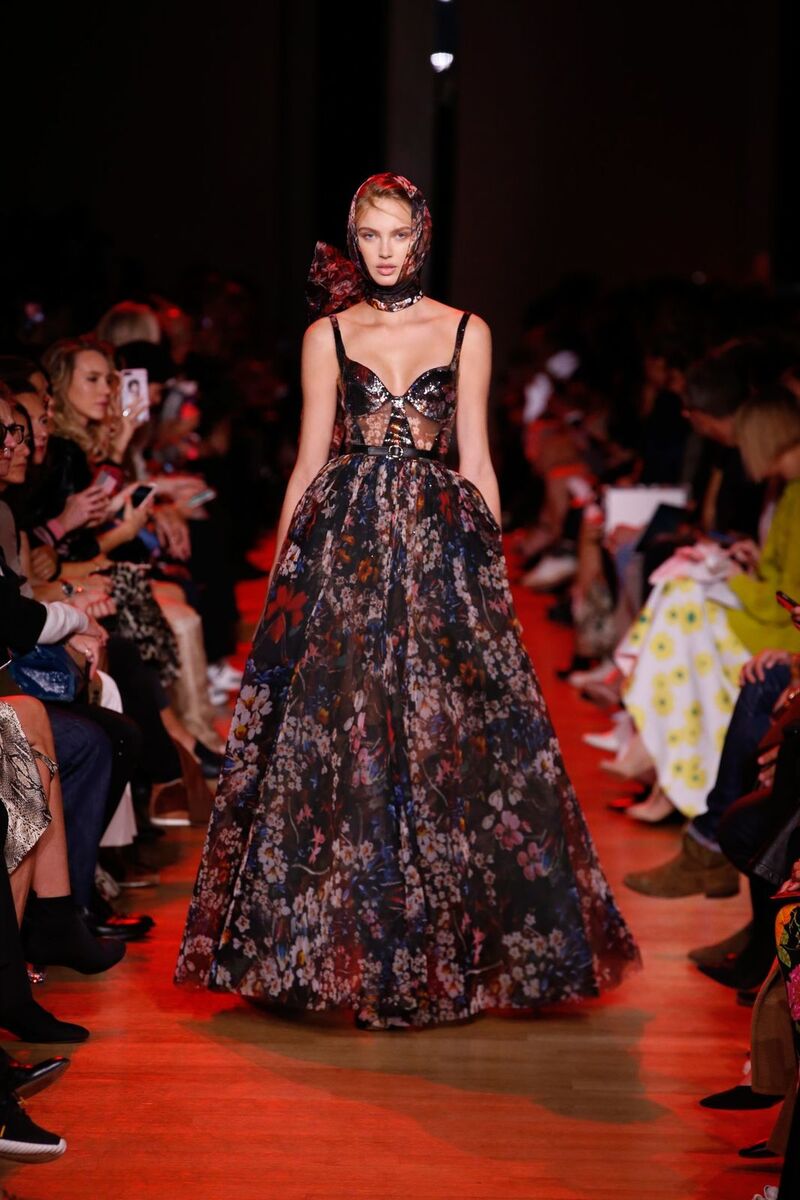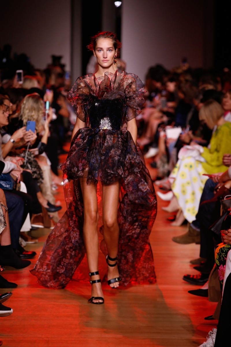 Elie Saab opened up his fashion show by a flood of white models, subsequently replaced by a wave of flowers, lace, stripes and bold designs. The luxury collection of SS19 displays a whole range of colours, clearly dominated by timeless black.