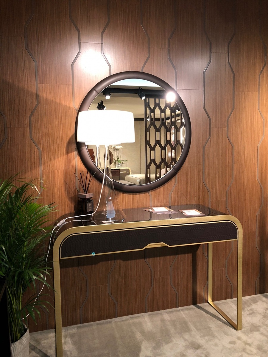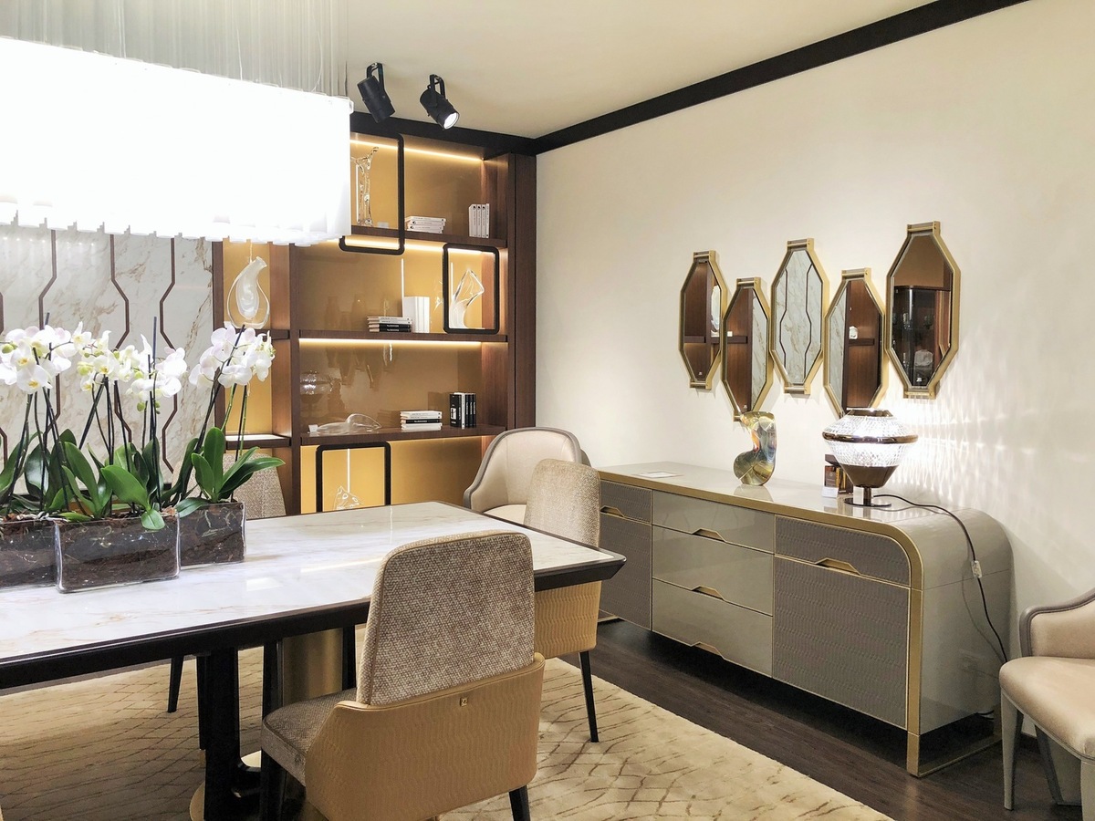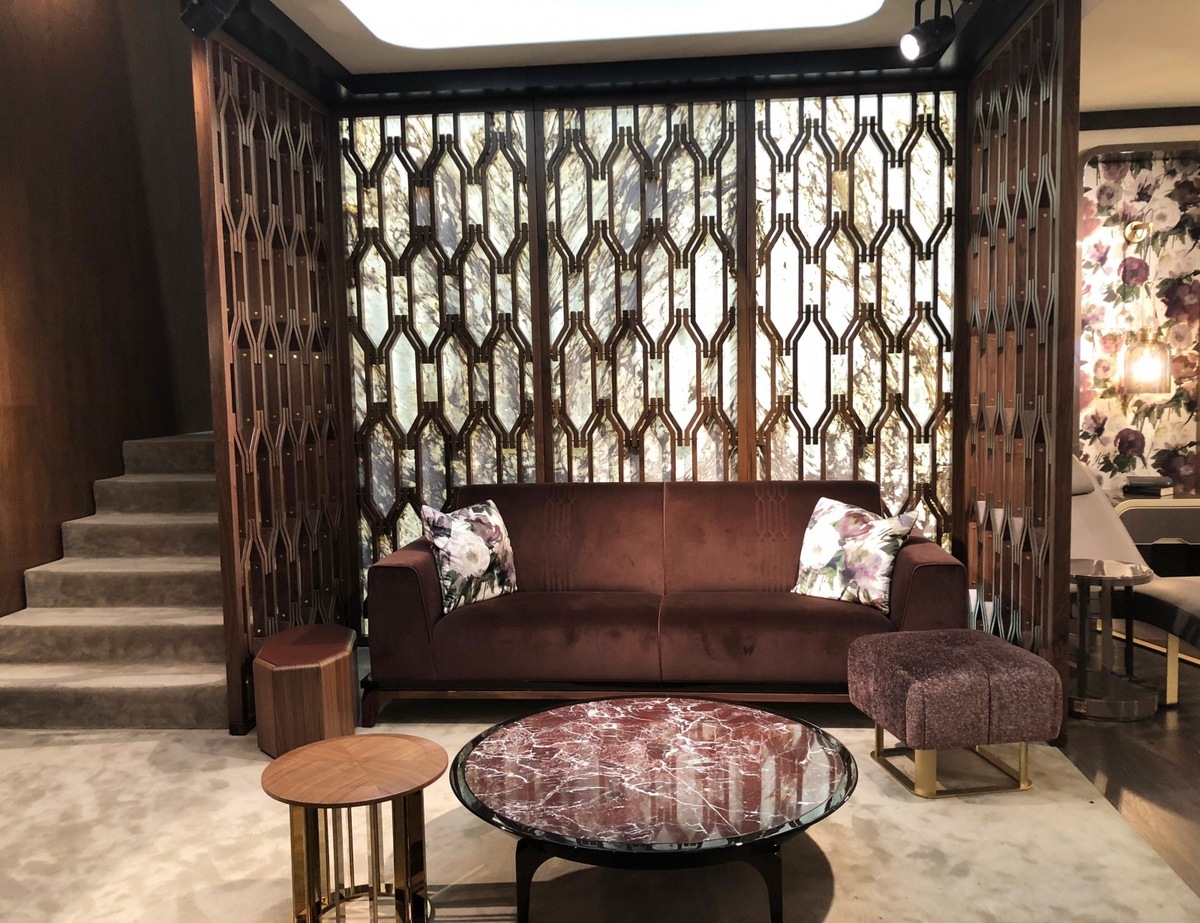 The brand has chosen the concept of balance of space. The wall is not closed here, but opens. Moving panels can be seen, decorated with a mosaic, fabric or leather. Very interesting is the placement of a rear light inside the furniture or the lighting of the back sides of the individual pieces. Light is also used to illuminate sculptures in the interior. At first glance, the use of rounded shapes instead of sharp corners is evident, which can easily evoke a retro style. Rounded shapes can be found on the chairs, tables, luxury upholstered armchairs, chests of drawers, even on the carpets.