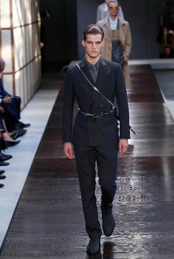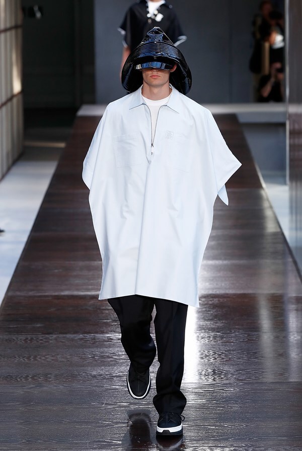 From the point of view of Riccardo Tisci it essentially does not matter which path will you choose for the next season of Spring/Summer; both will be trendy. Remember action movies Kingsman? Then you too, will no doubt recall them when looking at the luxurious stylish jackets in combination with an umbrella. It is the umbrella, which became an inseparable part of the main character, Harry, played by charismatic Colin Firth. Riccardo Tisci decided to bring this model to the next level and quite unexpectedly attached chains to the umbrella. Transformation of a sleek dandy into an unbridled maverick? Why not?