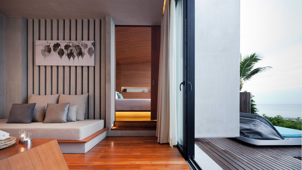 The Duplex Pool Suite (90 m²) and Duplex Grand Pool Villas (110 m²) have the same furnishings and equipment, but are set over two floors with a spacious living room on the ground floor.
