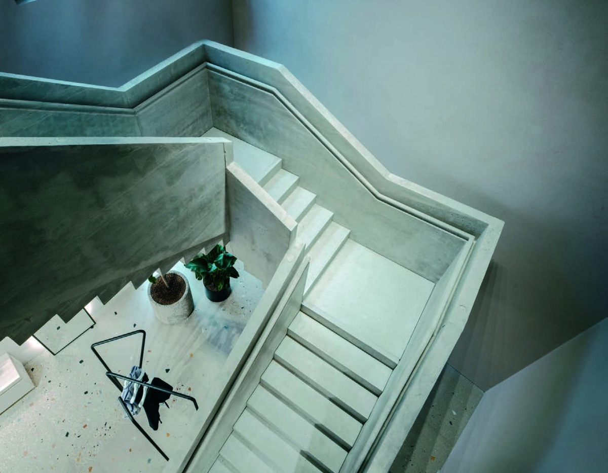 The stone floor with precious stone insets goes well with the black metal hangers. The showcases also have their own unique look: you can for example admire their diverse shapes and interesting materials used such as terracotta, onyx or hand-crafted linden. The whole atmosphere is livened up by greenery. The walls are colour-coordinated with the concrete floor thus unifying the look of the whole space in a respectable manner.