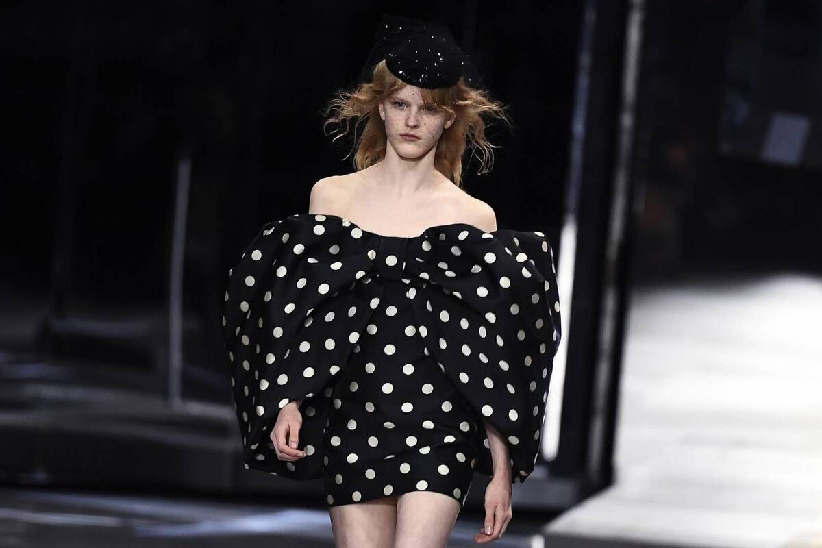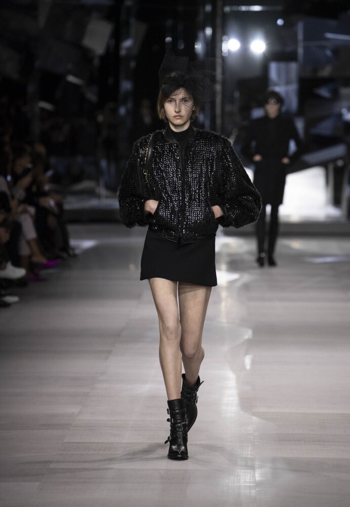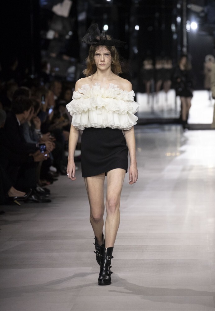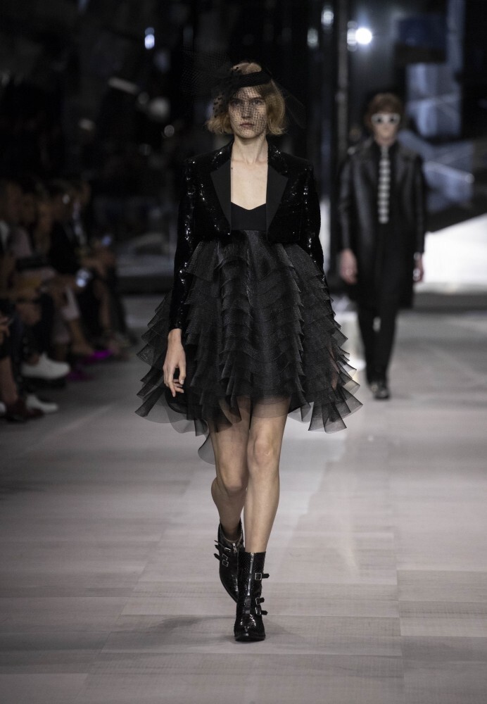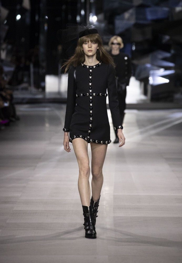 My favourite is also a black mini dress with a long sleeve and a cross decoration complemented by a perfect beret, where drama is again played by a fine mesh. A more typical French model cannot even be imagined... yet it never goes out of fashion. Perfection all around!