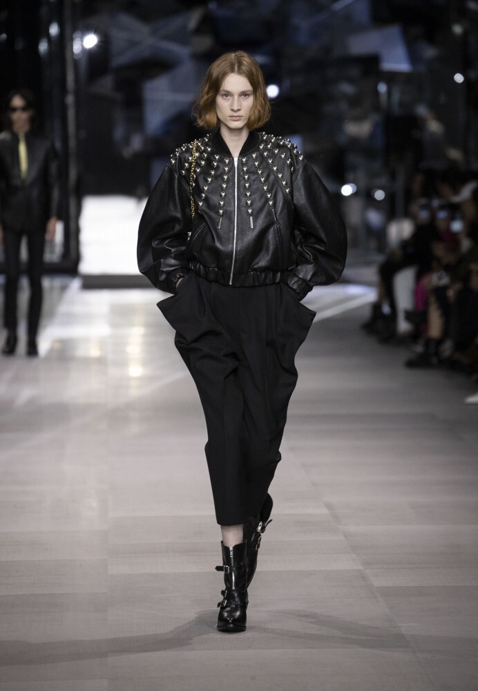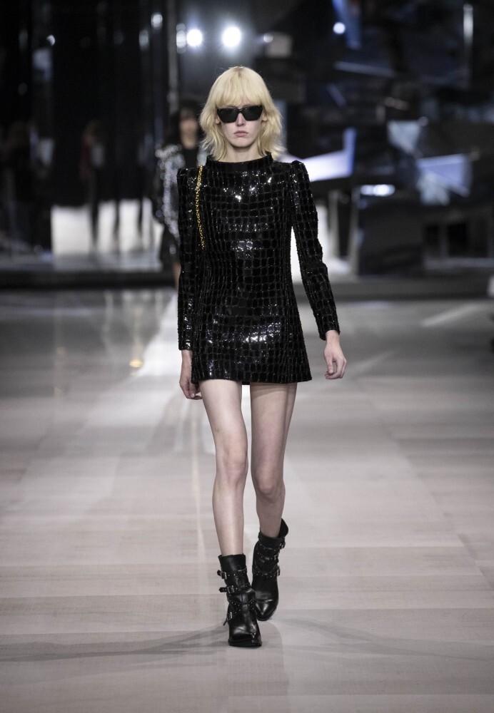 Slimane features mini dresses that let the beautiful long legs of the girls stand out in the Céline collection SS19. Of course, rocker boots with straps and leather jackets are not missing. As for classic black models, they never look boring and simple. They are decorated with silver details such as studs, zippers and sequins. The collection also includes man elements. We like high-waist trousers with a slightly lower seat worn with a shirt and a jacket, or denim high-waist trousers with leather details on the pocket and on the bottom hem combined with a fancy fur.