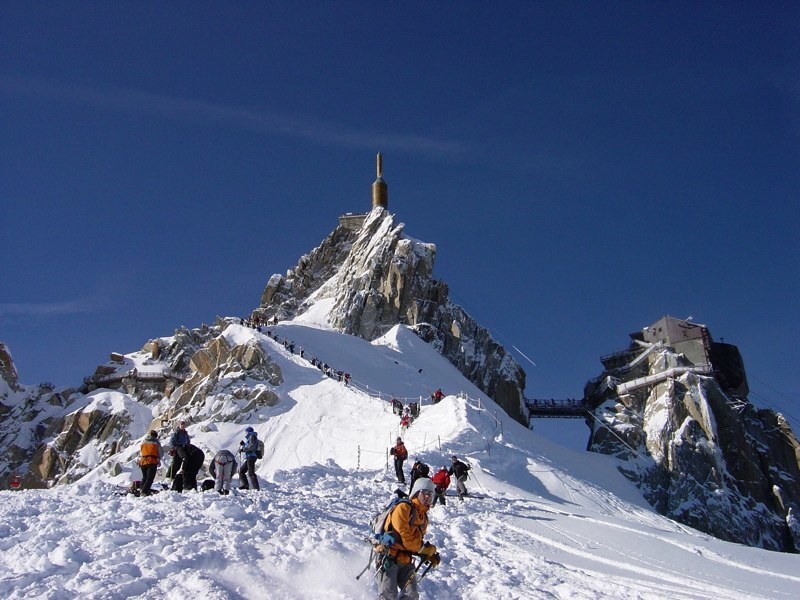 The cable car starts in the center of the luxurious town of Chamonix (1035m) and leads up to the top of Aiguile du Midi (3842m). The ride takes about 20 minutes, during which you can enjoy a view of Mont Blanc. The first cable car ride takes you to Plan de l'Aiguille (2317m) and the second one to the Les Pelerins iceberg (3778m). A walkway will then lead you to a lift that takes you another 42 meters up to the top of Aiguille du Midi. Here you will see a 360° view of the whole mountain massif. There are also several terraces where you can enjoy the view of French, Swiss and Italian Alps. During favorable weather, you can see Matterhorn (4478m), Monte Rosa (4634m) and other peaks. This is the highest point you can reach by a lift; from here on you need to proceed on foot.