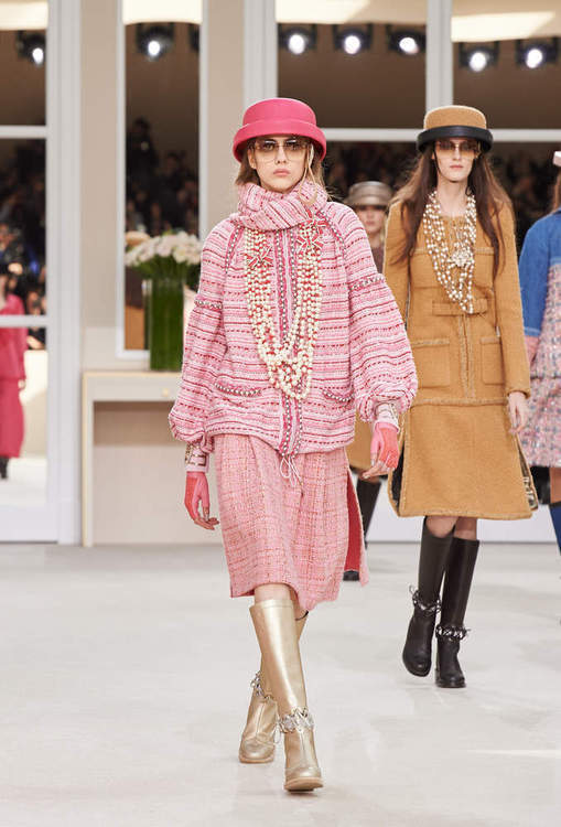 The color palette includes ground tones, the delicate old-pink, and hues of prominent colors such as magenta, fuchsia and crimson. The black-and-white classic is of course also included, this time with special elements such as a creamy lace contrasting black varnished leather. Accessories include traditional layered pearl necklaces, camellia in the form of buttons or brooches and luxurious felt hats.