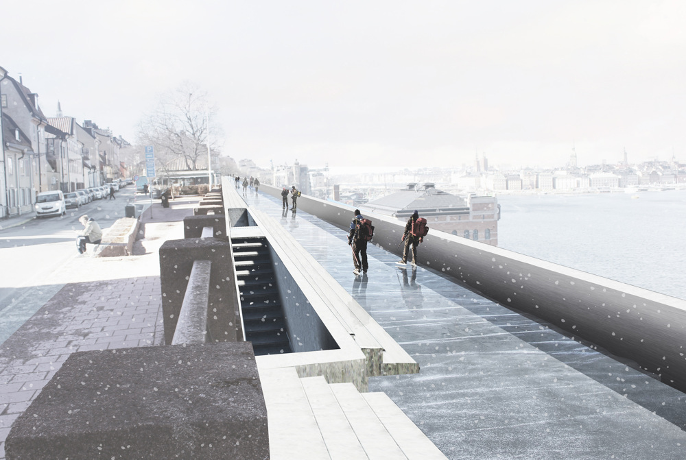 The design foresees the creation of a few hundred-metre-long narrow public pool, which will be created along the elevated pavement above the road that runs through the relatively busy Södermalm district that is also called "Slussen".