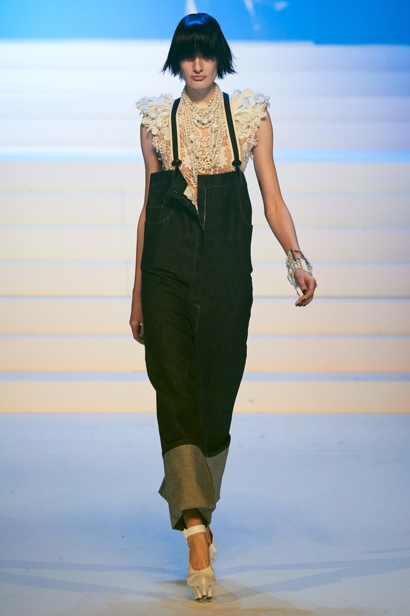 Most of the models are too daring for me, to be honest, and I would only wear them for a swingers-themed party, but I did find a couple wearable pieces one can boast while strolling through the town. This, for example, is a brilliant model in my opinion. A very sexy top and comfortable pants with braces. Together, it forms a bizarre spectacle, where you can't decide if the wearer is about to paint her room or head to the catwalk. The pumps with stoppers not unlike those you can see on footballers are, in my opinion, not only pleasing for the eye, but also practical, no matter if you just want to walk in them, or paint that room.