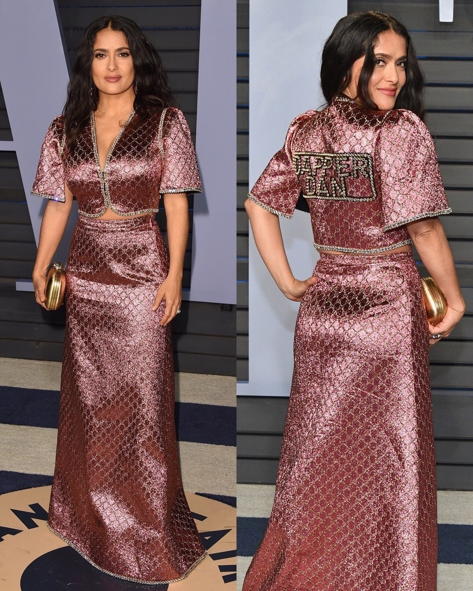 Then, completely out of the blue here, is actress Salma Hayek in a sparkling ensemble of cherry-red colour. Unfortunately, I don´t think this is the right kind of Holywood sparkle. Because thanks to the collection of "Dapper Dan" Salma was turned into a cheap-looking concubine from Japan's red-light district, Harajuku. Simply horrid!