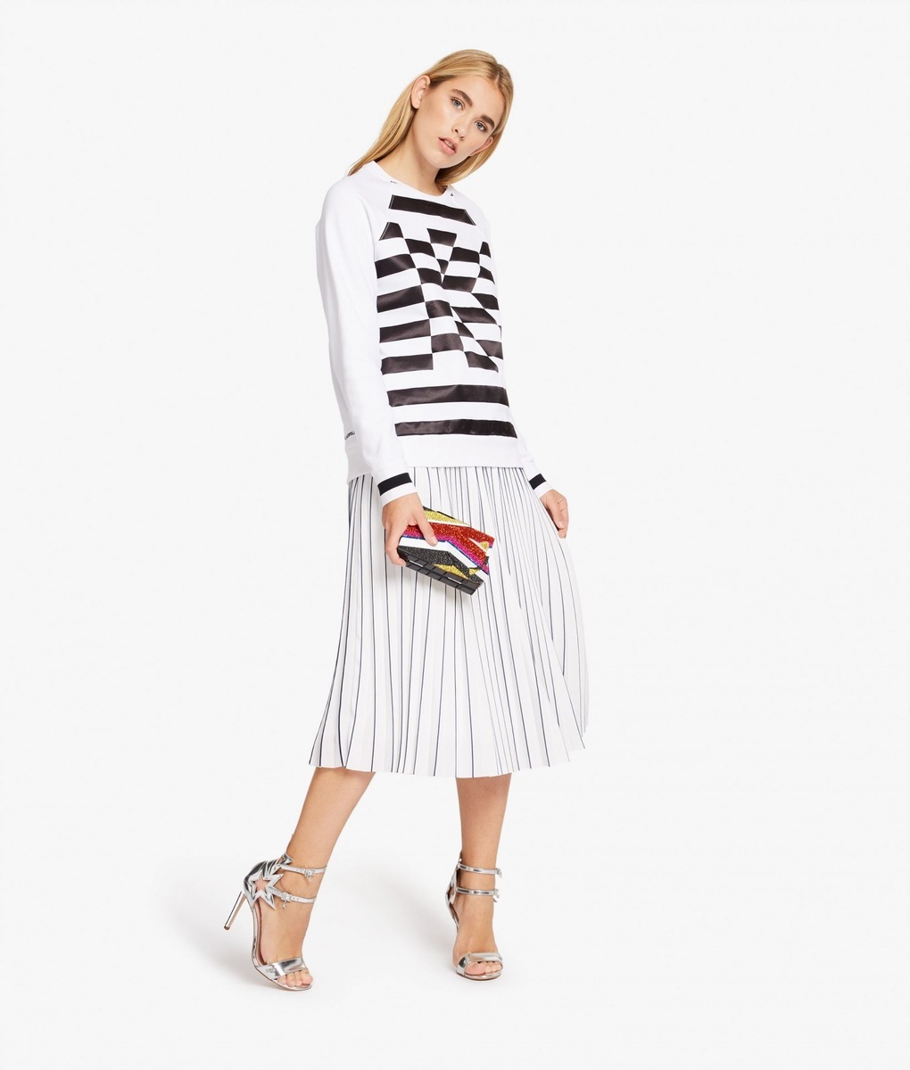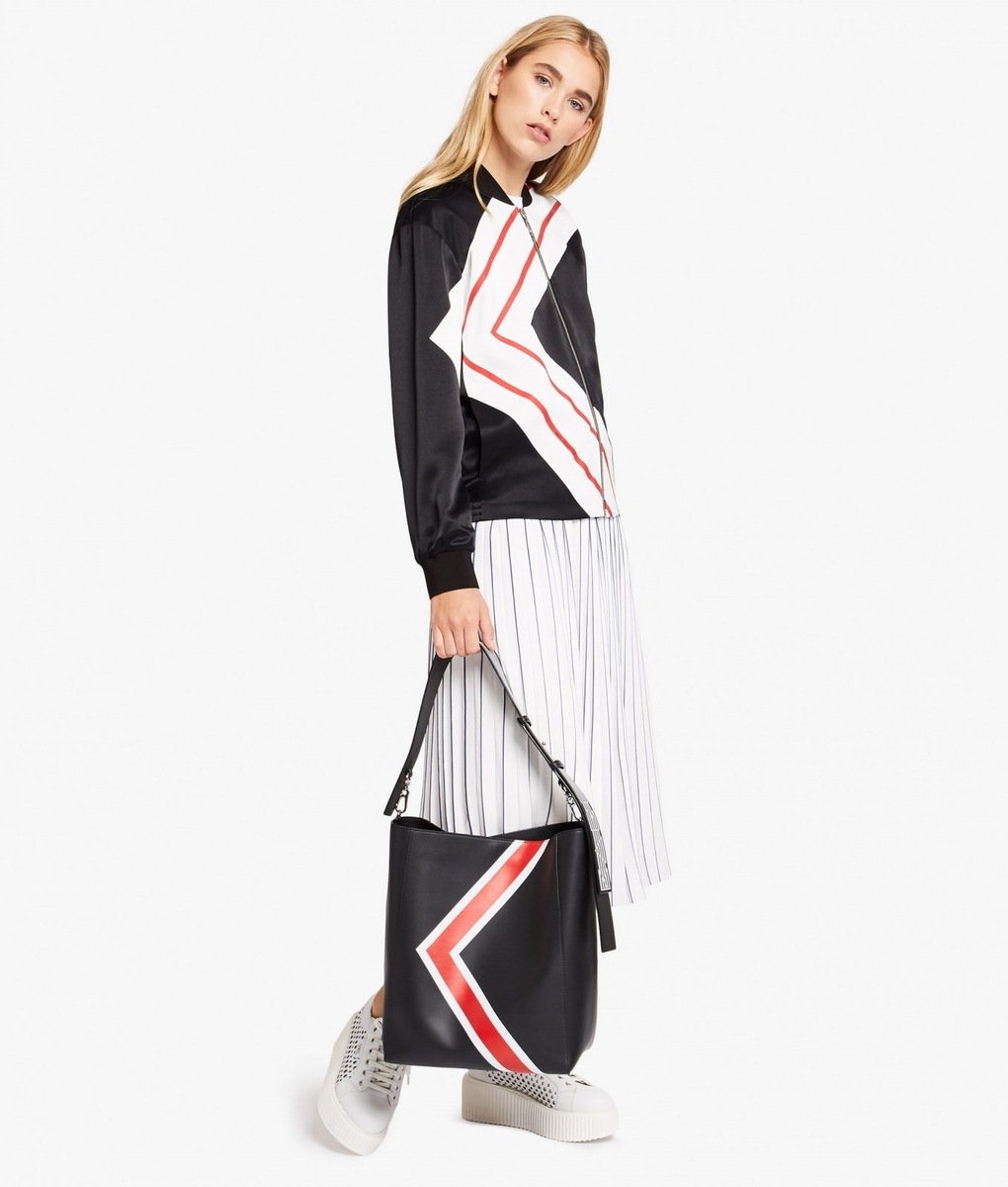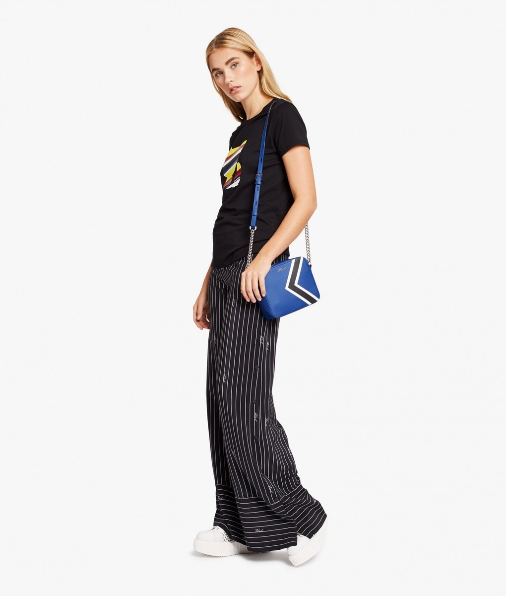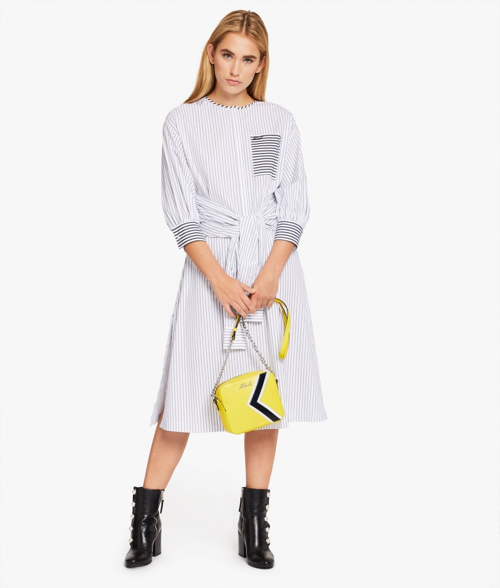 A stylish affair her are the handbags K/STRIPES Shoulder Bag and Camera Bag. While the Shoulder Bag may be purchased in a classic black or deep red, when creating the Camera Bag Karl Lagerfeld also reached for yellow or blue. The icing on the cake of the entire collection is a black-and-white shirt-dress, playing with stripes in nouvelle directions and also the luxurious striped dress with cuffs on the sleeves. The Stripes collection furthermore consists of tops, skirts, trousers, handbags, key pouches, baseball caps or mobile phone covers.