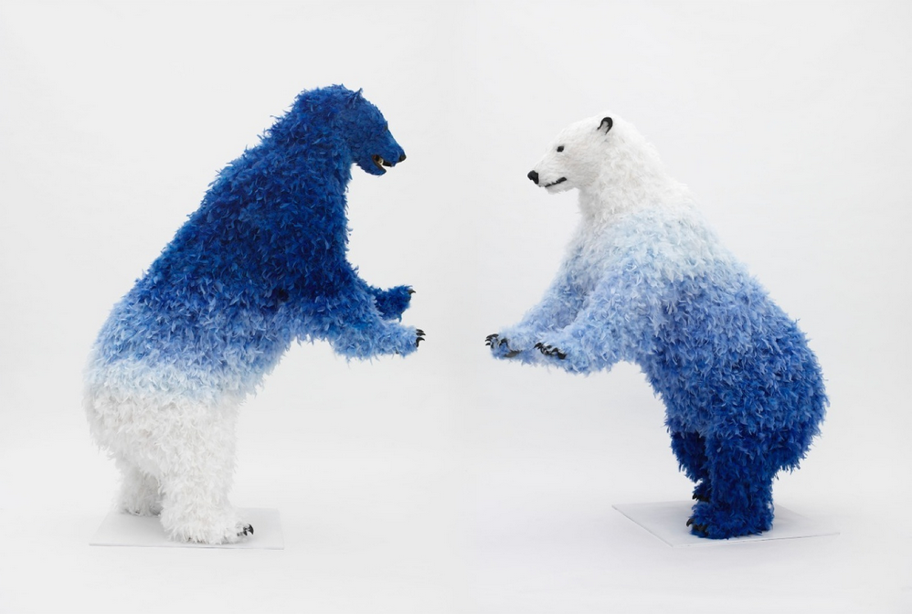 One of her best-known works is the deluxe statues of bears made from small coloured feathers, for which she probably found inspiration in Alaska. These cute and entertaining bears have found a place in many galleries and are also a deluxe interior decoration.