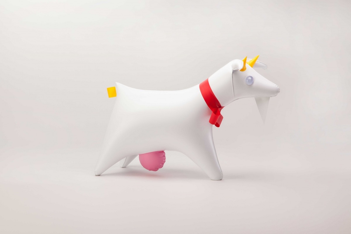 The formula one model is bright yellow and since last century racers broke speed records in it. Today, little boys may become formula drivers without being injured. All the toys bear a luxury certificate Safe Toys. In addition to racing, the formulas may drive into a depot where the mechanic tops up the air pressure in the wheels. The goat only has three legs, a blow-up udder and thanks to the transparent eyes the small observer may look into the bowels of the animal. Also, it in a funny way reflects the name of the authors. The ergonomically-shaped tractor in blue has white inflatable wheels and daily leaves to go on a field.