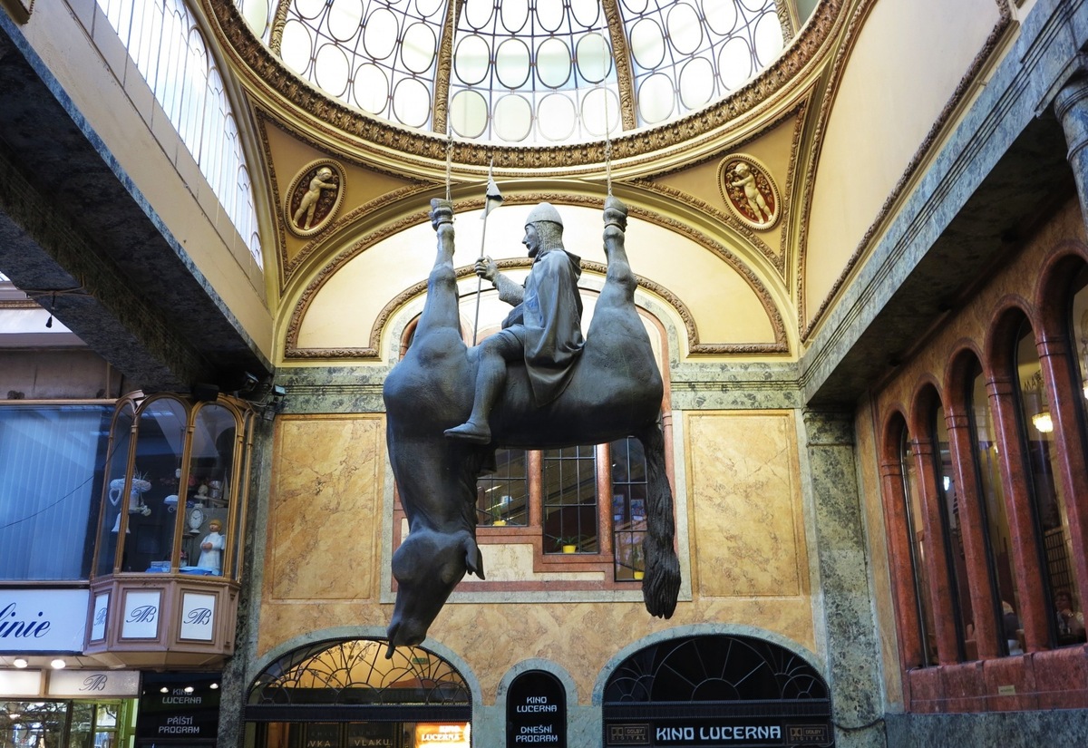In addition to its exceptional interior, Palace Lucerna also boasts a statue that is scoped out by hundreds of Czech and foreign tourist cameras every day. In front of the stairs to the upper floors of Lucerna Passage, lift your gaze upward. You will see the Horse statue, which depicts St. Wenceslas sitting on the belly of his dead horse. This luxury statue was created in 1999.
