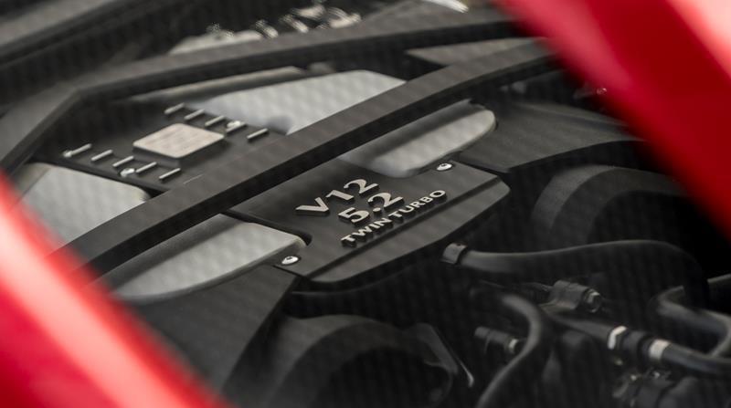 The aggressive design is dominated by a robust radiator grille, and the air vents. It has a muscular body, reflecting what is hidden under the bonnet: a 5.2 litre V12 twin turbo that boasts an output of 715 hp (533 kW). The torque is 900 nm. From 0 to 100 km/hour in 3.4 seconds and from 0 to 200 km/h may be achieved in 6.4 seconds. The maximum speed is 340 km/h.