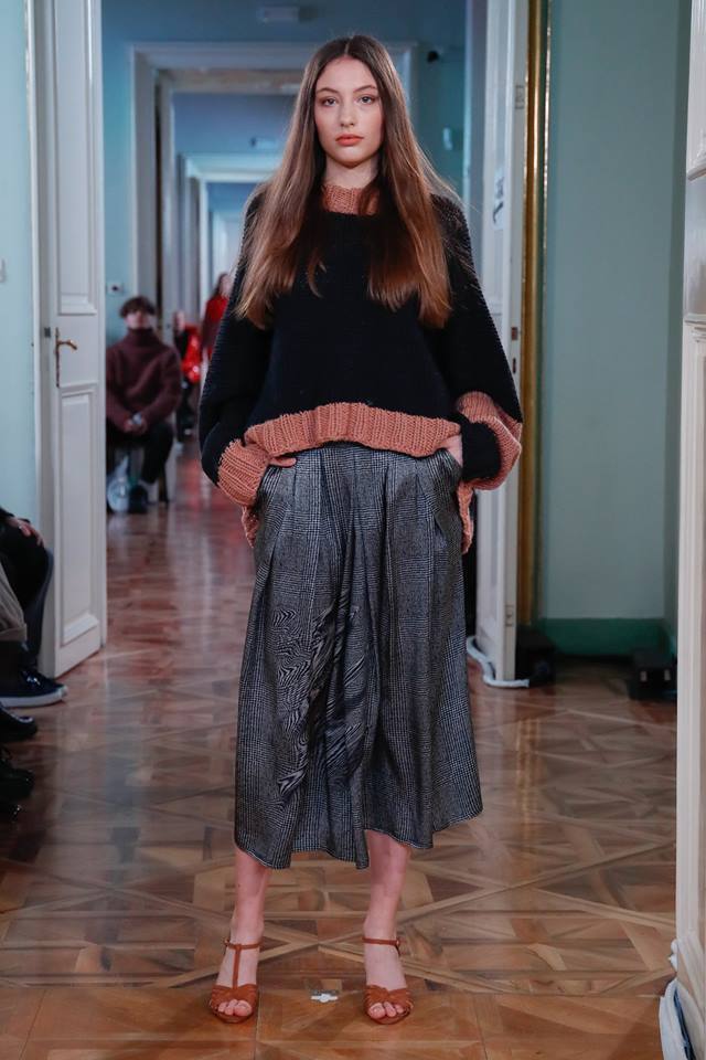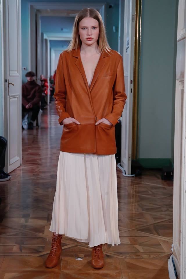 Denisa Nová’s favourite materials include wool, deluxe leather and silk. These are exactly the materials she integrated into her FW18 collection and this is why we could see classic and maxi knitted sweaters, sleeveless dresses and trousers made from velvety silk, leather jackets or deluxe accessories in the form of handbags and shoes also made from leather.